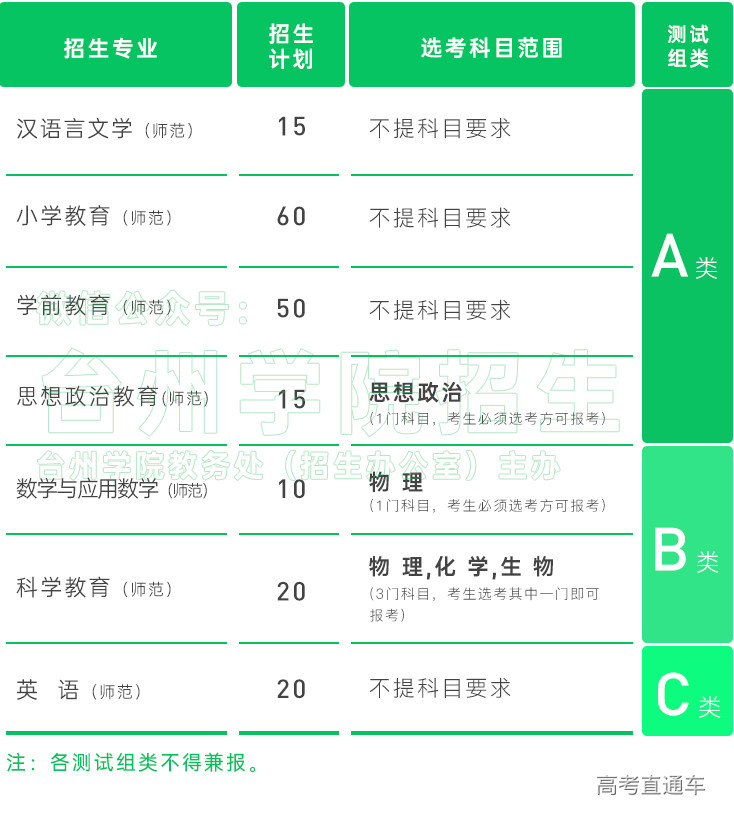 入围考生须参加浙江省2021年高考普通类的报名和考试,志愿填报在浙江省普通高校普通类提前录取统一填报。在填报学校志愿时考生须在五个院校志愿档的第一志愿栏填报“台州学院”,否则无效。专业志愿只能填报入围测试组类中的专业,且符合所报专业的选考科目范围要求(即在符合选考科目要求的情况下可兼(单)报入围测试组类中的各专业或选择专业服从调剂)。未被录取的考生可正常参加浙江省高考志愿填报和录取。