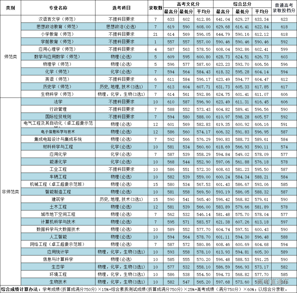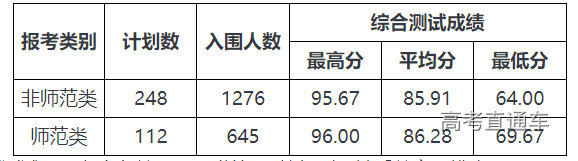 自我推荐入围2586人。通过自我推荐形式获得测试资格的考生共计2586人,其中师范类823人,非师范类1763人。符合章程规定报名条件的考生中,师范类通过书面评审中的最后一名考生学业水平测试各科目折算成绩为125分,A的个数为5个,语数外等第折合分35分,语文A、数学B、外语B,最后同分同排序同入围。非师范类通过书面评审中的最后一名考生学业水平测试各科目折算成绩为115分,A的个数为3个,语数外等第折合分30分,语文B、数学B、外语B,最后同分同排序同入围。