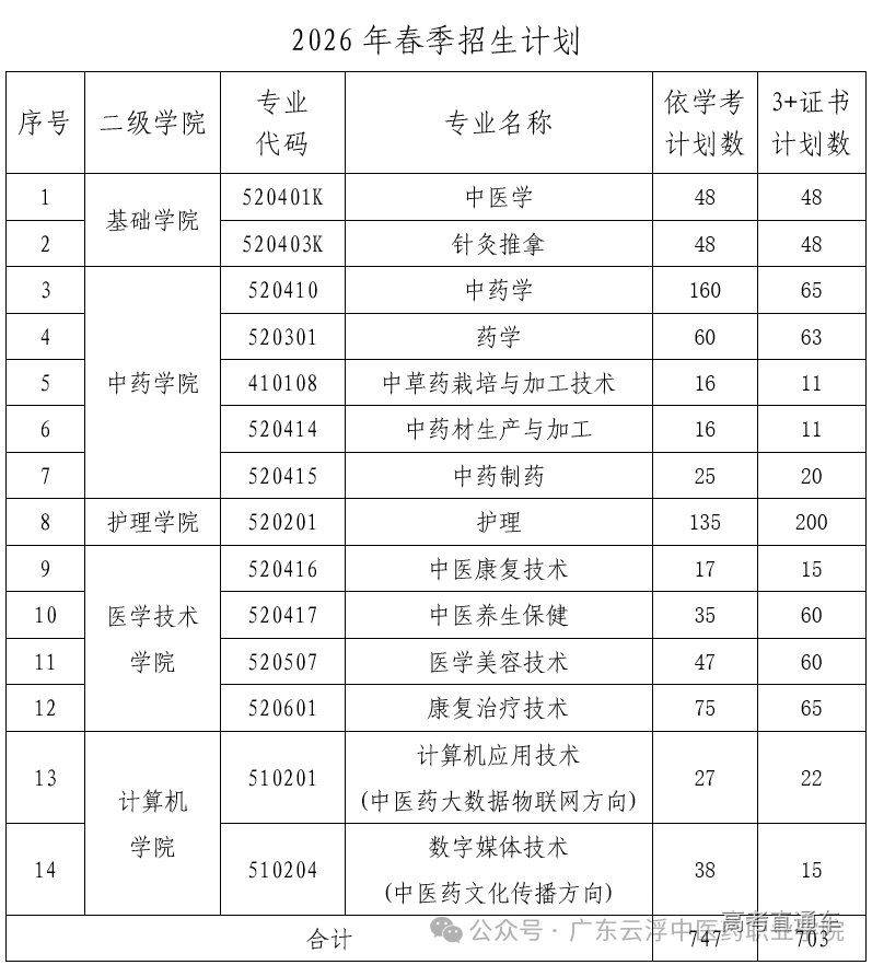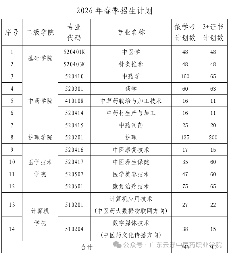 我校2026年春季高考依学考招生计划数747人,3+证书招生计划数703人,具体见下表: