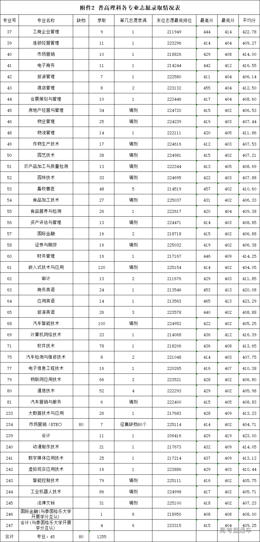 理科招生计划1335人,出档1335人,最低投档分402分,最低排位225154。录取1255人,退档80人,退档原因:不服从专业调剂。各专业录取情况见附件2。