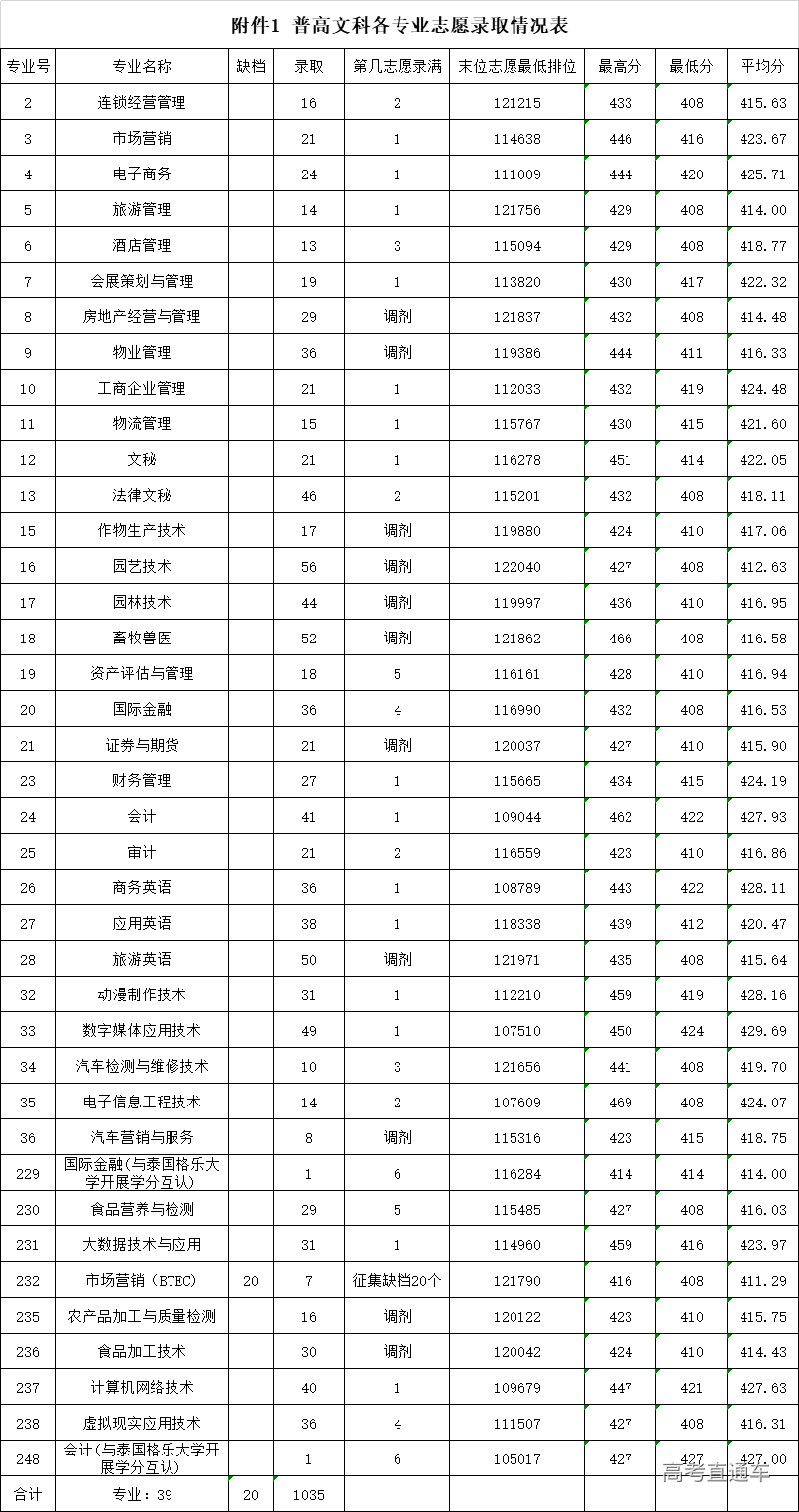 文科招生计划1055人,出档1055人,最低投档分408分,最低排位122040。录取1035人,退档20人,退档原因:不服从专业调剂。各专业录取情况见附件1。