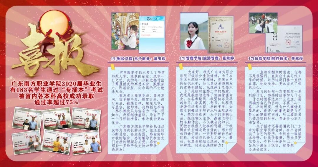 我校2020年共有183名同学在参加广东省普通高等本科插班生的招生考试之后,成功录取到自己心仪的本科院校。录取成功率达75%。可谓是又一次达到了新高度!!!