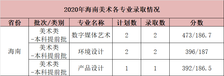 华软学院2020年在陕西省美术类提前本科艺术本科B段计划招生5人,实际录取考生5人。在海南省美术类本科提前批计划招生5人,实际录取考生5人。