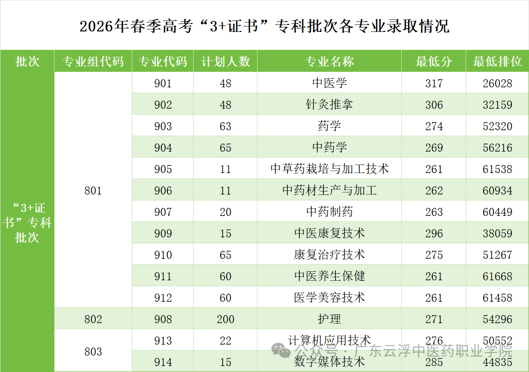 因个别考生填报志愿不合理、不服从专业调剂,导致被退档,我校“依学考录取”普通类护理专业缺额43个计划、中药制药专业缺额6个计划;“3+证书”批次中医养生保健专业缺额3个计划、医学美容技术专业缺额8个计划。据广东省教育考试院公布的2026年春季高考招生录取工作日程安排,征集志愿将于3月30—4月2日进行。请有意向报考我校的考生密切关注广东省教育考试院微信公众号,及时获取征集志愿信息。
