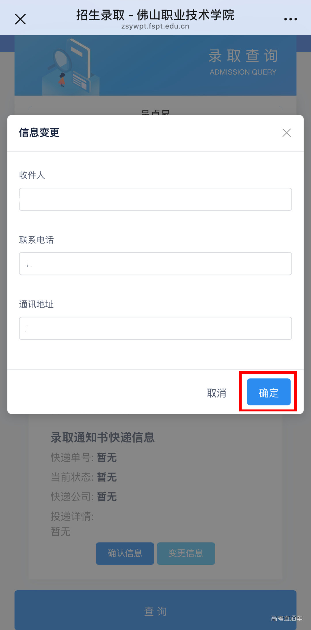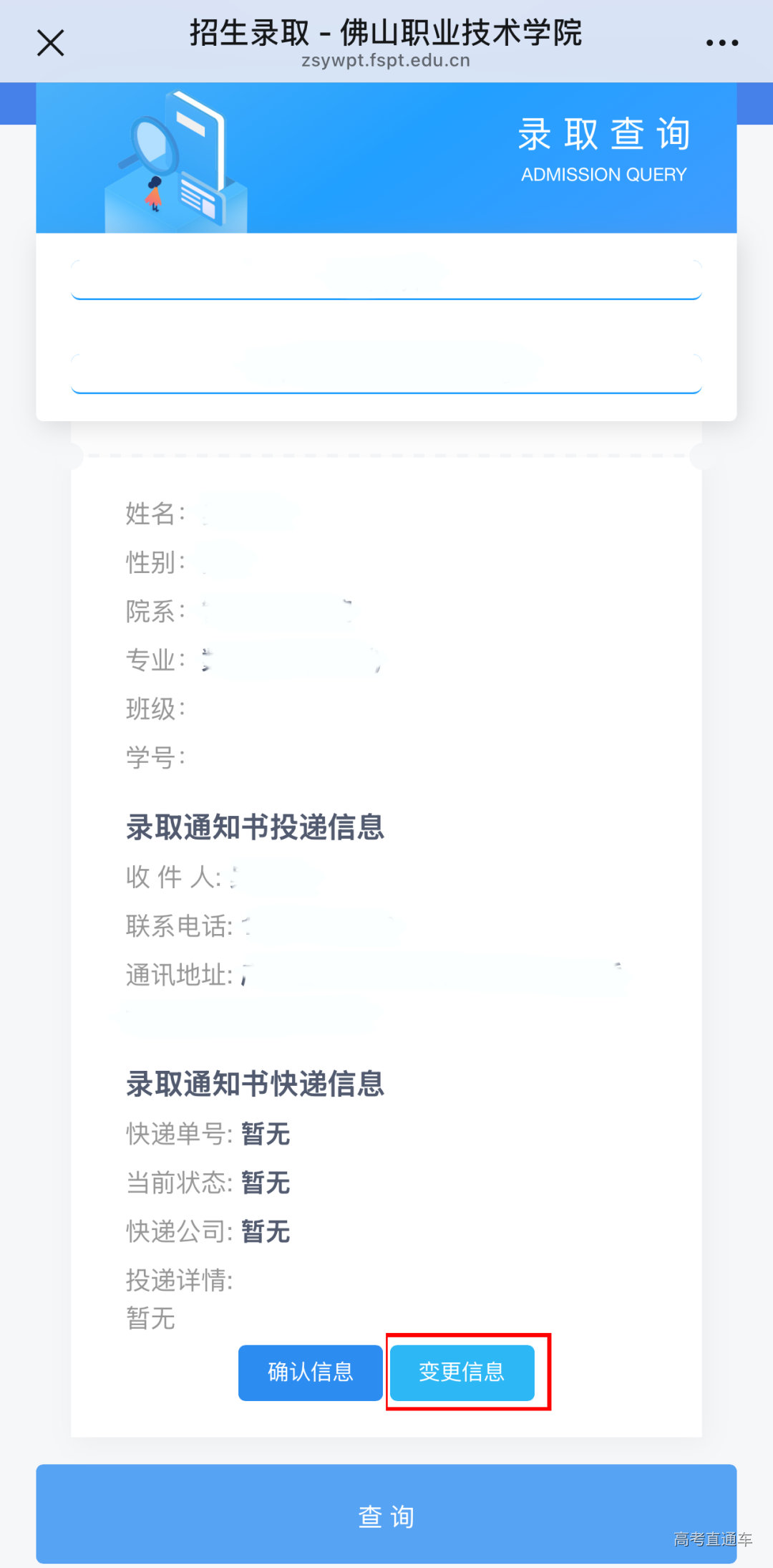 温馨提示 我校将按照各位考生在2025年高考志愿填报时填写的联系方式邮寄录取通知书。若需修改,请通过关注“佛职院招生与就业指导中心”公众号,点击“招生服务—录取查询”,输入考生姓名和身份证号进入查询结果界面;然后点击“信息变更”,输入正确的收件人、联系电话和通讯地址,最后“确定”即可修改。修改时间截止至8月8日12:00。