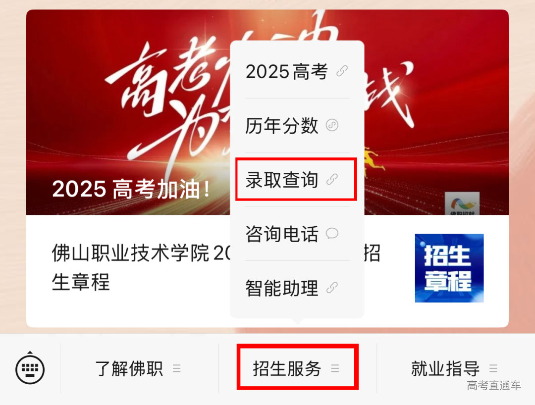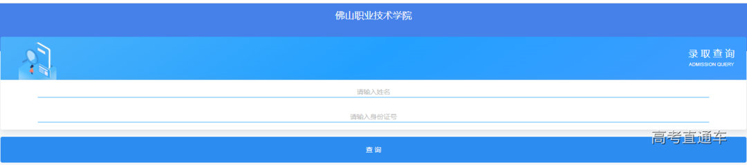 录取查询 1 学校招生信息网 点击网址:https://zsywpt.fspt.edu.cn:2083/admission,进入录取查询界面,输入考生姓名和身份证号即可查询。 2 佛职院招生与就业指导中心公众号 扫描下方二维码,关注“佛职院招生与就业指导中心”公众号,点击“招生服务—录取查询”,输入考生姓名和身份证号即可查询。