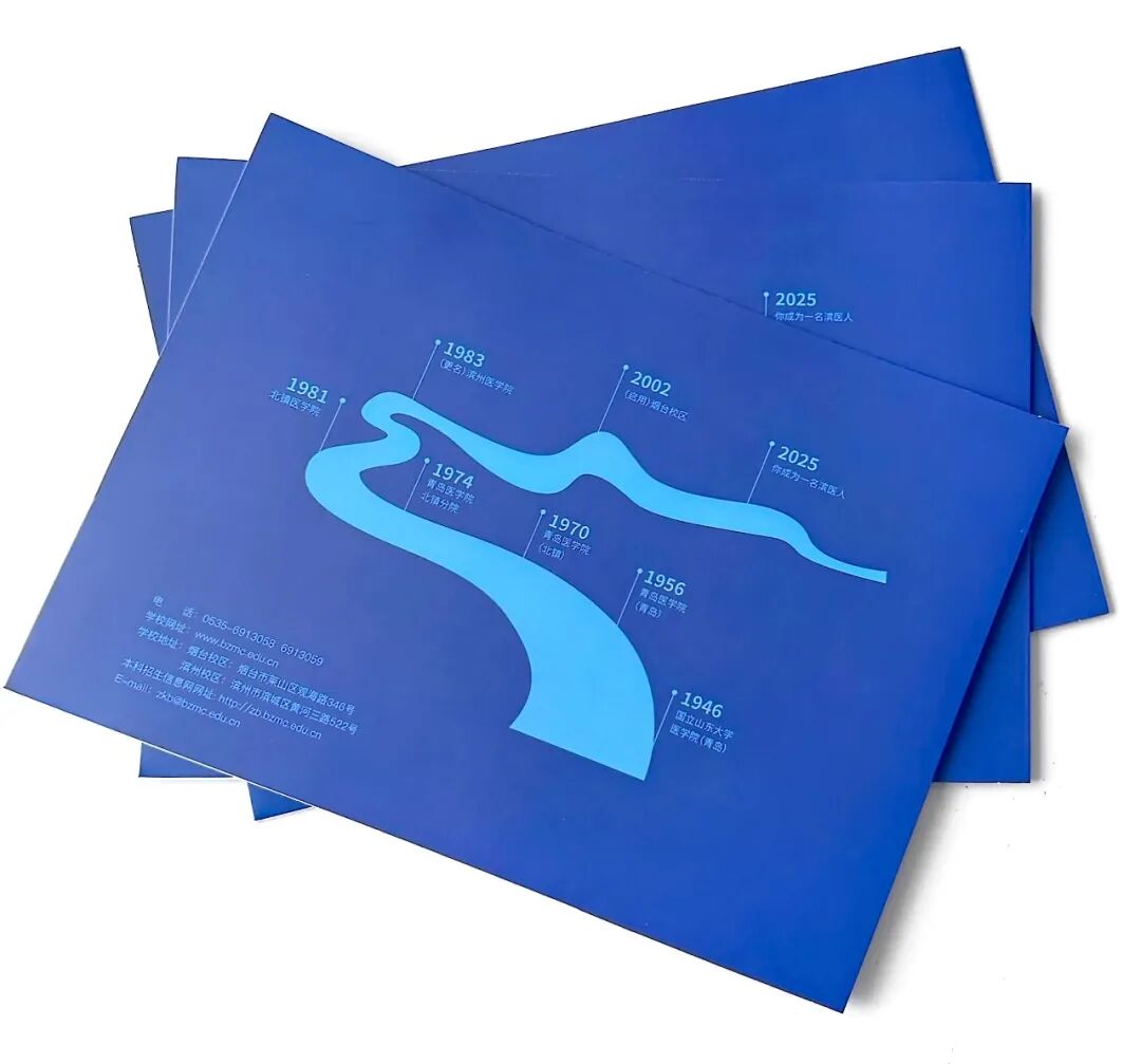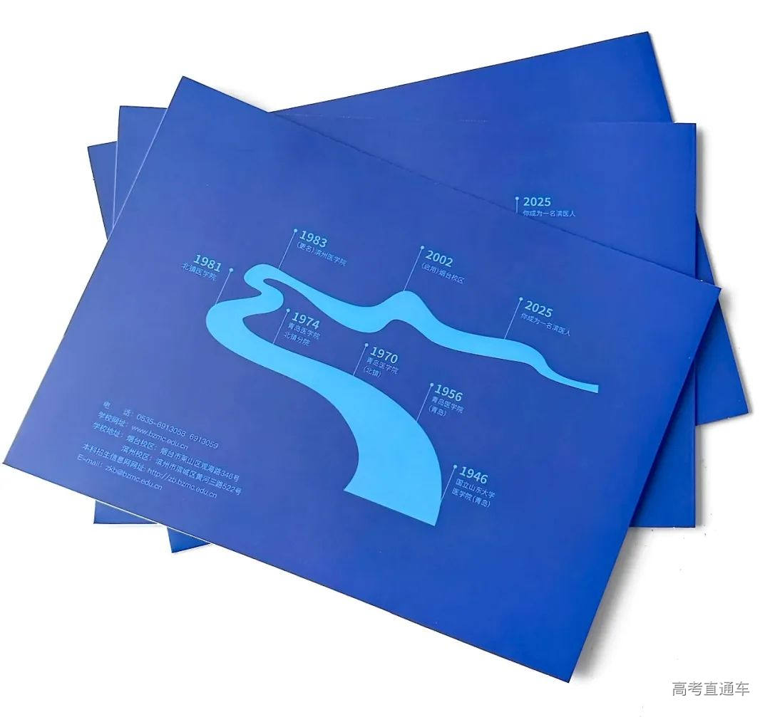 录取通知书采用简洁的封套设计 主色调选用沉稳深邃的滨医蓝 “经纬生命,启耀滨医” 以热烫工艺呈现学校标志性地标建筑 海浪、银杏叶、医学符号DNA双螺旋 环绕其间 体现医学特色与科技融合 形成动态视觉层次 暗喻学子在滨医的成长轨迹