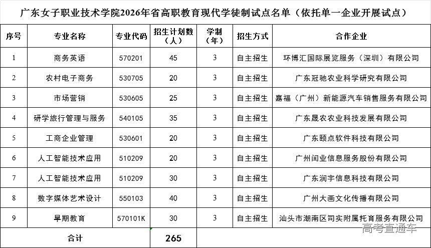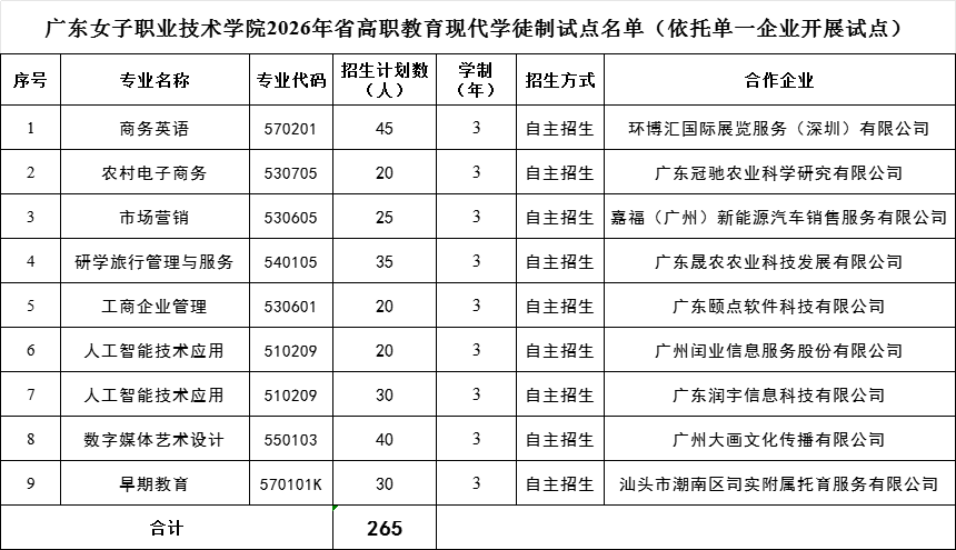 根据广东省教育厅发布的《关于做好2026年省高职教育现代学徒制试点工作的通知》(粤教职函〔2026〕1号),我校2026年现代学徒制共有8个专业,招生计划数共计265人,试点方式为“先招工后招生”。 招生对象 试点招生对象为符合广东省2026年普通高校招生统一考试报名工作文件规定高考报名条件、国家和省试点相关文件、试点高职院校相关要求,参加2026年普通高考报名并确认报名资格的考生。 以下3类人员不能参加今年自主招生(现代学徒制试点)报名: 1.被学考/3+证书录取的考生; 2.被中高职贯通三二分段录取的考生; 3.没有获取2026年高考报名号的考生。 招生计划 备注:所有的教学组织与实施主要在企业完成。 招生方式 招生方式:自主招生现代学徒制 招生时间:预计4月下旬至5月上旬 (以广东省教育考试院发布的通知为准) 报考条件 除获得2026年广东省高考报名号外,还需满足以下条件方可报考: 1.属于试点合作企业在职员工; 2.与试点合作企业签订合法有效的劳动合同(合同期限须涵盖录取学生学习期间); 3.由试点合作企业购买3个月(含)以上社保(统计截止时间为2026年4月30日)。 特别注意: 1.在录取前,考生须与学校、试点合作企业共同签订现代学徒制培养三方协议; 2.高职自主招生现代学徒制试点考试招生的具体安排以广东省教育考试院公告为准。 联系我们 咨询电话:020-34557001、020-34557502 学校网址:http://www.gdfs.edu.cn 招生网址:http://zsxx.gdfs.edu.cn/ 联系地址: 广东省广州市番禺区南浦村段2号(番禺校区) 广东省广州市海珠区新港西路大江冲29号(海珠校区)