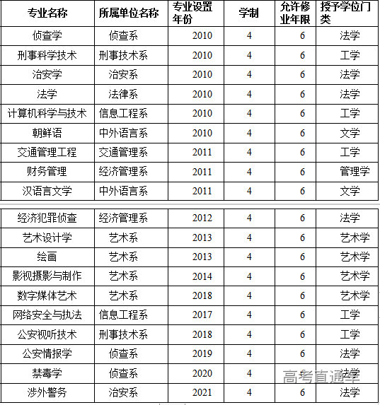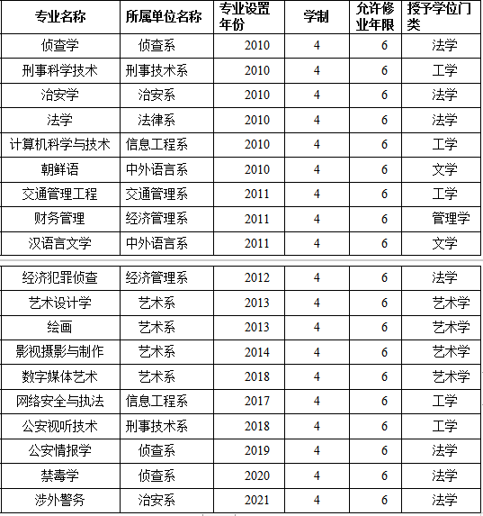 学院现有本科专业19个,其中法学7个占36.84%,工学5个占26.32%,管理学1个占5.26%,艺术学4个占21.05%,文学2个占10.53%。省级一流学科2个。属于法学门类的专业有侦查学、治安学、公安情报学、禁毒学、经济犯罪侦查、法学、涉外警务;属于工学门类的专业有刑事科学技术、公安视听技术、交通管理工程、计算机科学与技术、网络安全与执法;属于管理学门类的专业有财务管理;属于艺术学门类的专业有艺术设计学、影视摄影与制作、绘画、数字媒体艺术;属于文学门类的专业有汉语言文学、朝鲜语