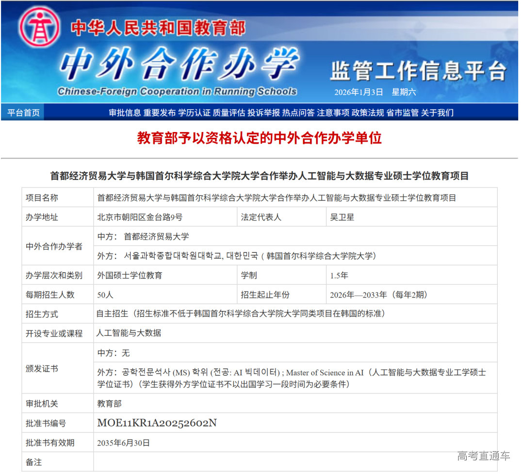 近日 教育部网站信息显示 首都经济贸易大学与 韩国首尔科学综合大学院大学 中外合作办学项目正式获批 标志着两校开启新的合作篇章