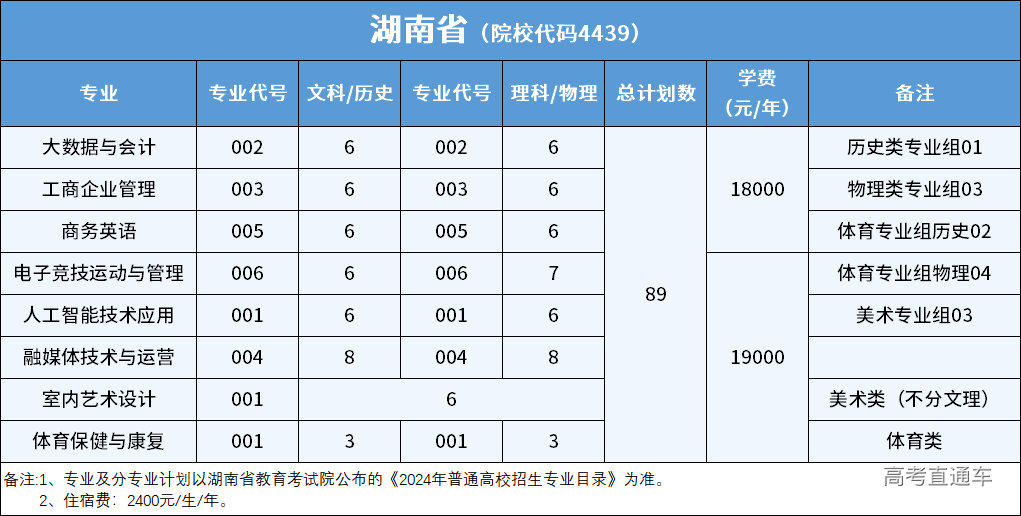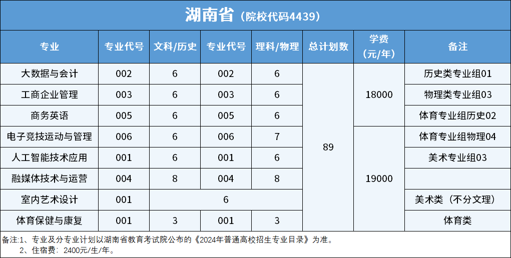 湖南 院校代码:4439 1 专科录取控制分数线 历史类:200分 物理类:200分 体育类:160分(文)/155 分(专) 美术类:160分(文)/155 分(专) 2 专科志愿填报时间 8月6日8:00—8日17:00 3 招生专业及计划 2024年招生计划89个,较去年增69个。 附表: