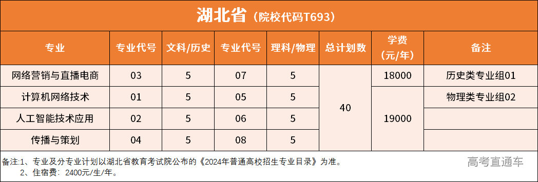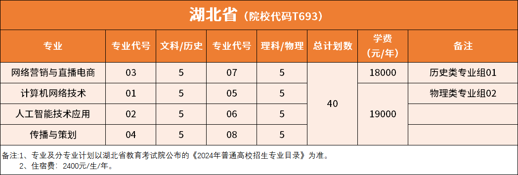 湖北 院校代码:T693 1 专科录取控制分数线 历史类:200分 物理类:200分 2 专科志愿填报时间 8月6日8:00—9日17:00 3 招生专业及计划 2024年招生计划40个。 附表: