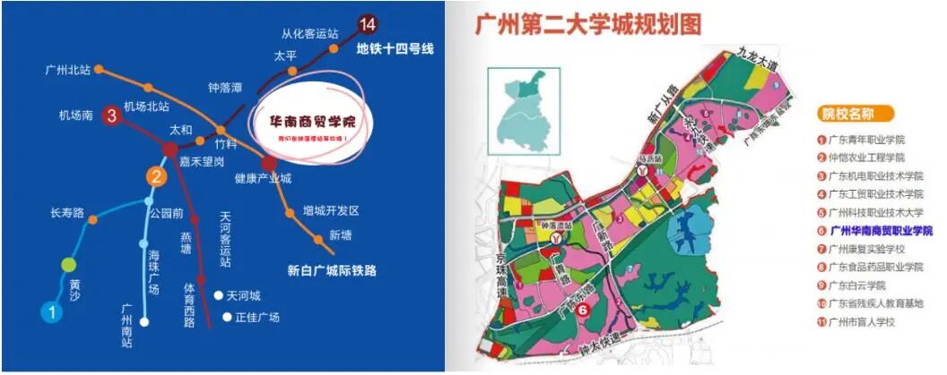 地处广州市,享一线城市资源 位于广东广州第二大学城 白云区钟落潭高校园区 坐享一线的便利和机遇 周边高校林立,拓宽人脉 校门口公交10分钟直达地铁站 方便快捷抵达周边机场和高铁
