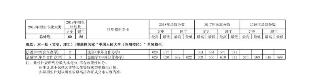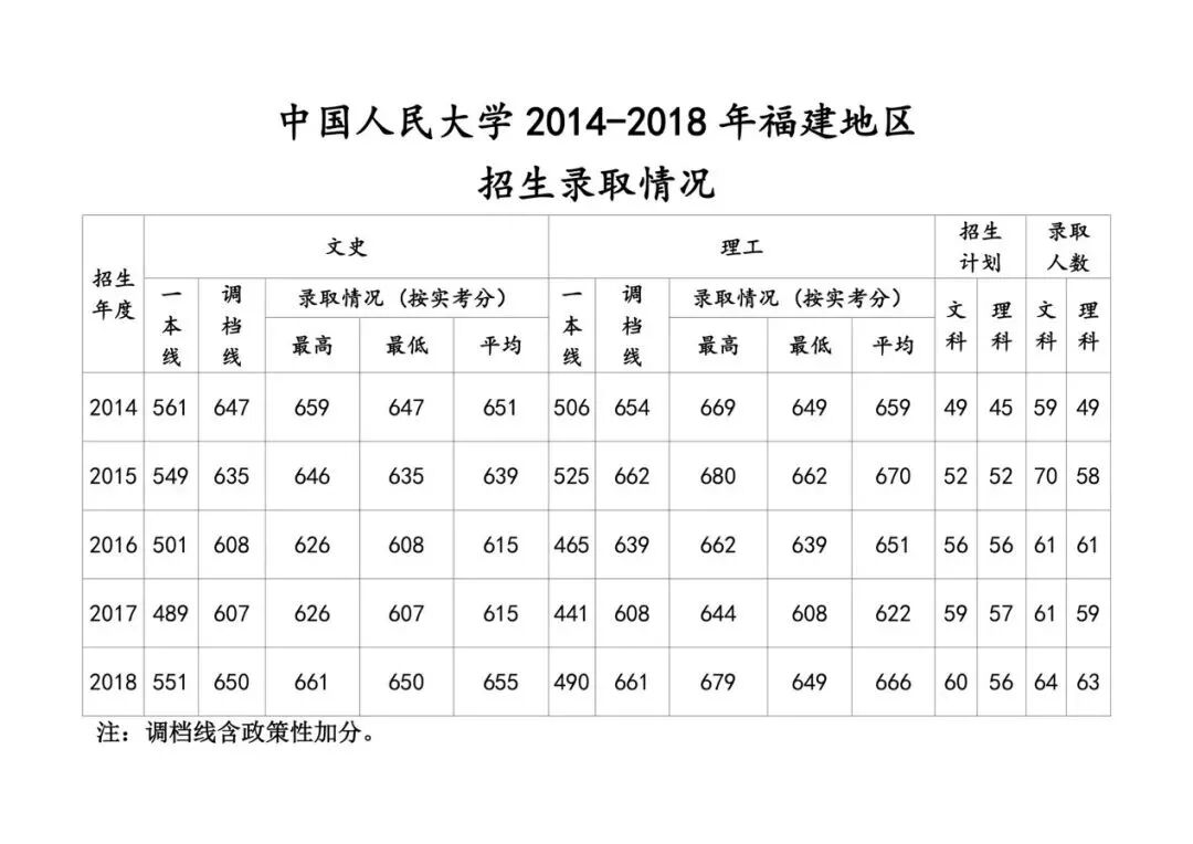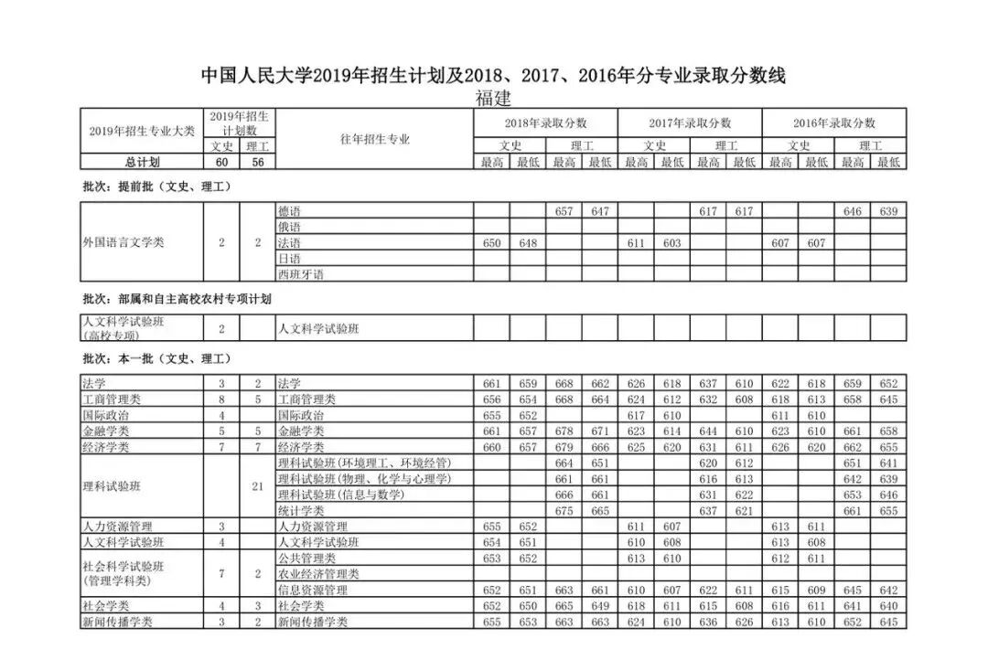 中国人民大学2019年在福建招生计划及2016-2018年分专业录取分数线