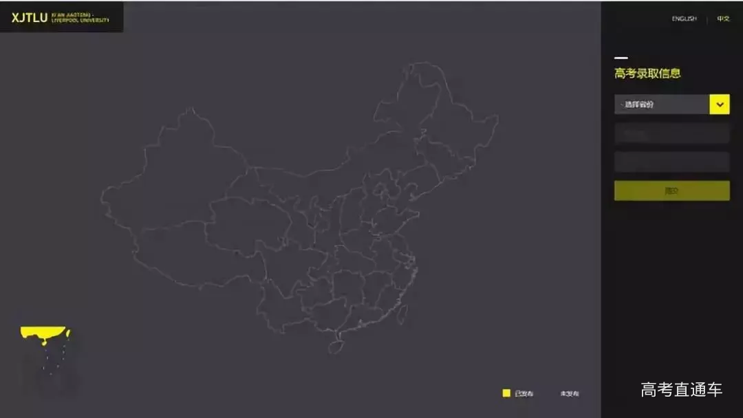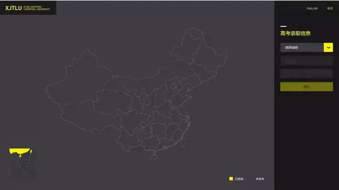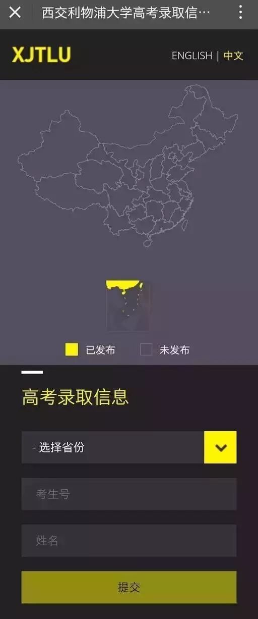 / 方式一 / 西浦官网首页 http://www.xjtlu.edu.cn/zh/ / 方式二 / 直接进入查询系统 http://www.xjtlu.edu.cn/gaokao/ / 方式三 / “西浦招生”微信公众号 黄色为已发布录取结果省份; 灰色为未发布录取结果省份; 当您所在省份的地图标示为黄色时,请在下拉菜单中选择省份,输入考生号和姓名即可查询录取结果。
