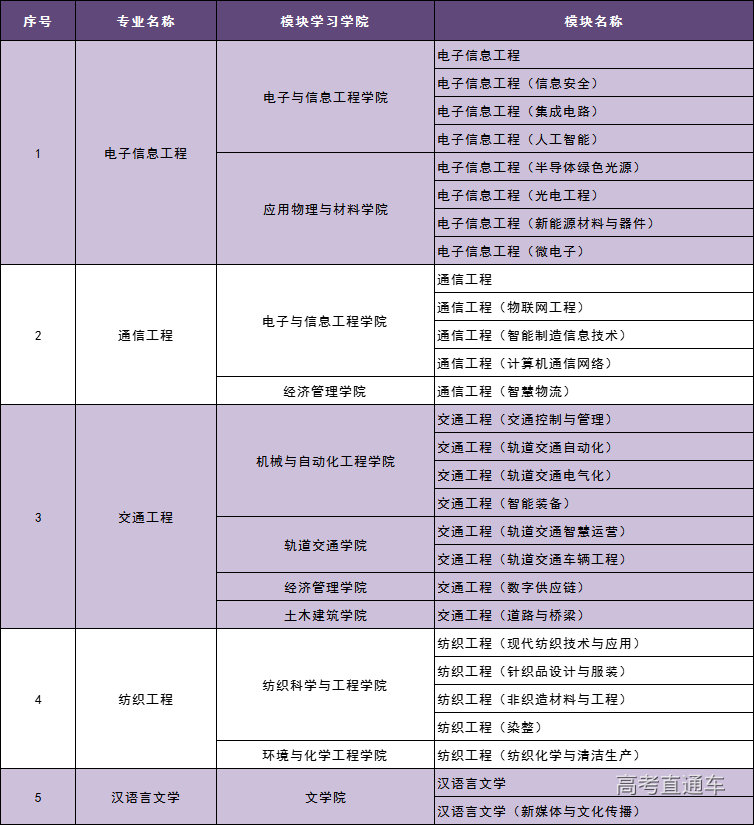 2.我校部分专业分模块培养,被分模块培养的专业录取,进校就读后,在第一和第三学期各有一次自由选择专业内其中一个模块进行学习的机会。具体分模块培养专业情况,请见下方。