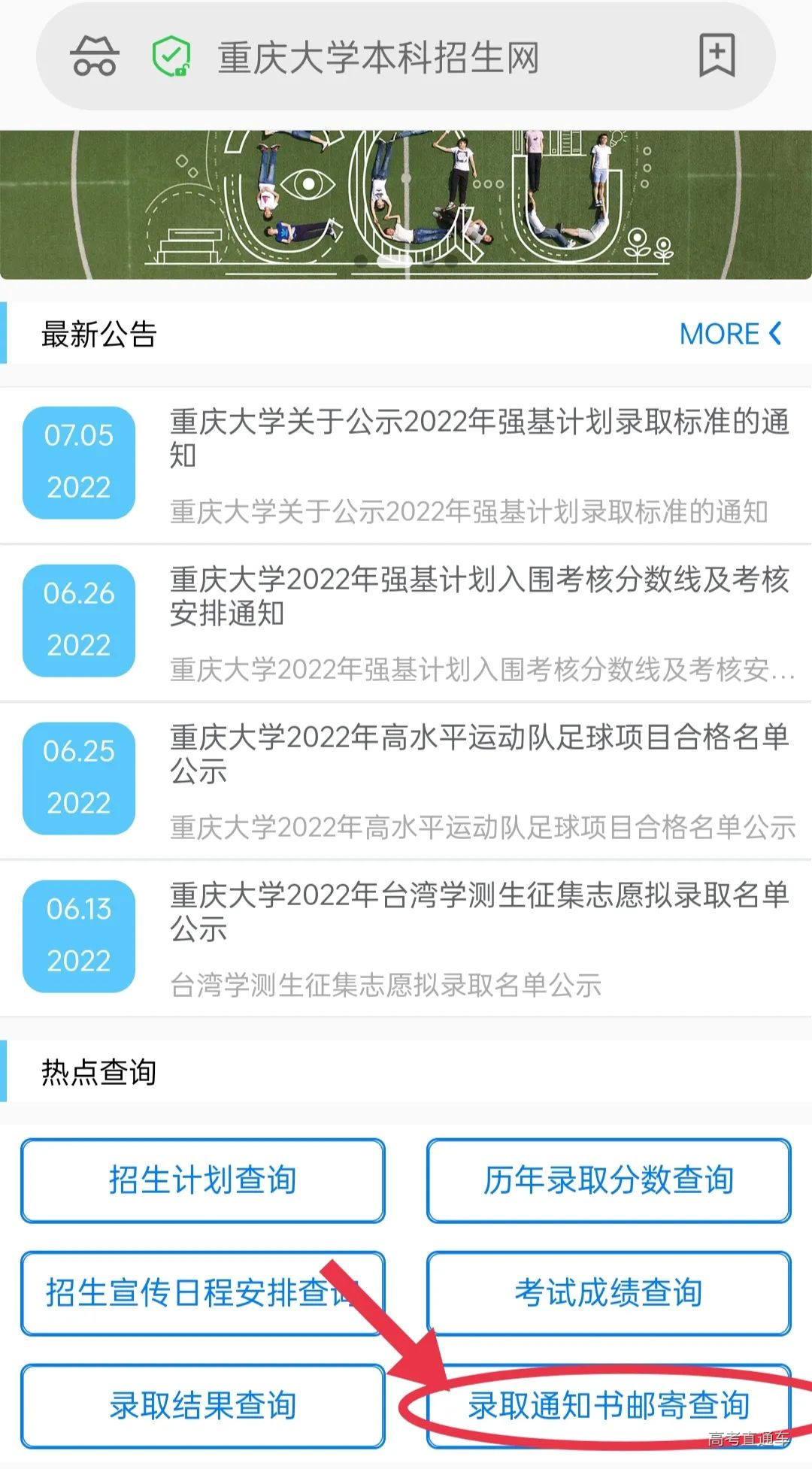 打开重庆大学本科招生网(zhaosheng. cqu. edu.cn),在“热点查询”中点击“录取通知书邮寄查询”板块。
