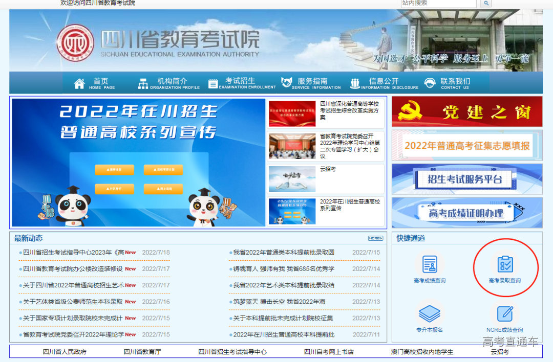 进入当地省招办官方网站(此处以四川省教育考试院为例),在快捷通道中寻找【高考录取查询】即可查询到最新的录取信息。