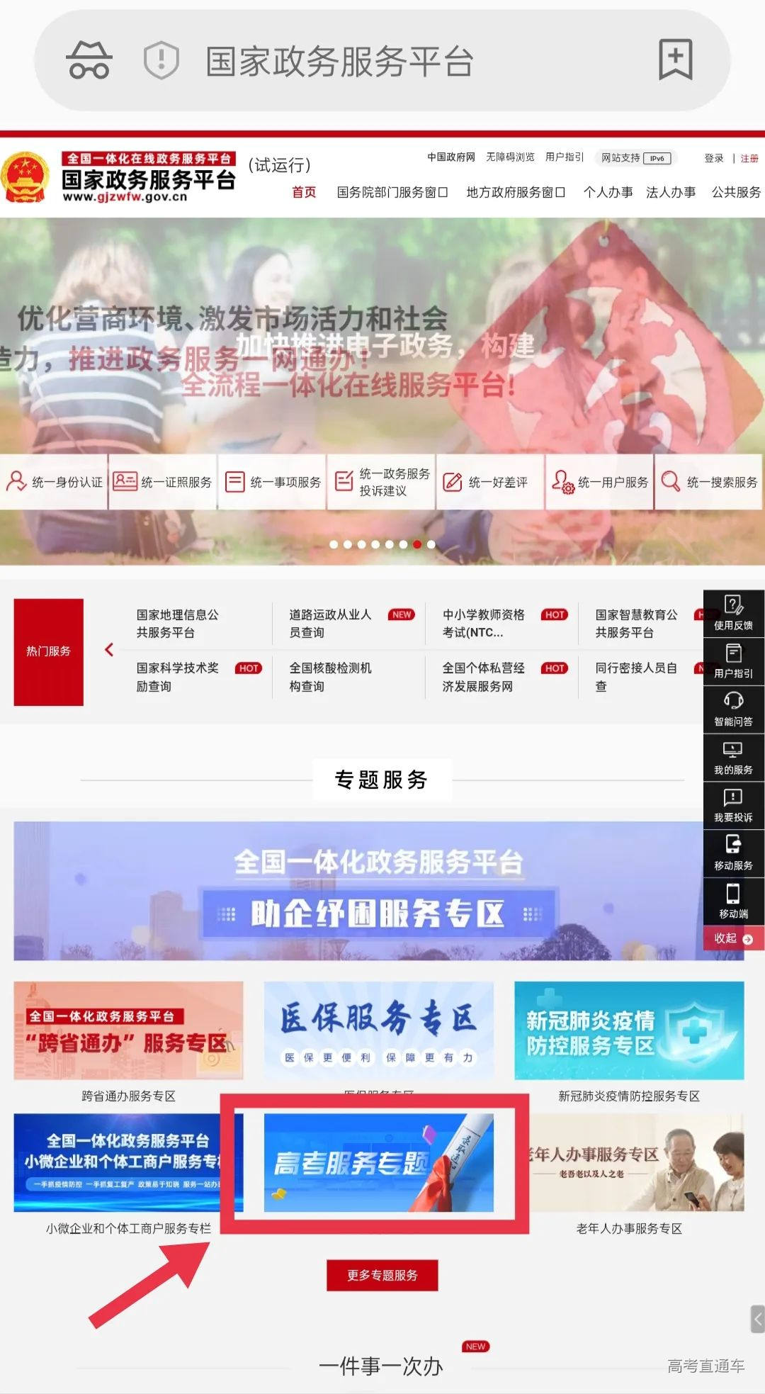 打开国家政务服务平台,点击“高考服务专题”,内含“高考录取通知书查询”板块。
