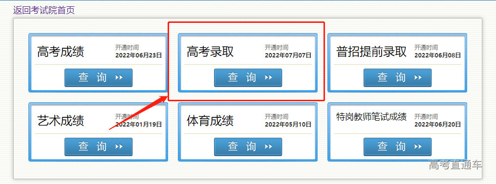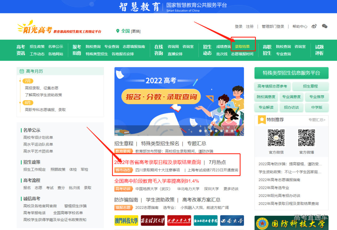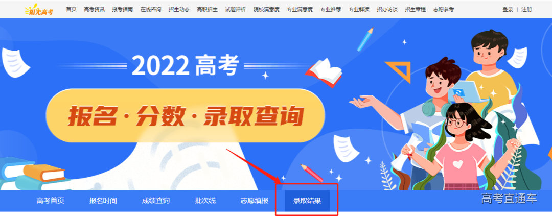使用任意浏览器搜索【阳光高考】网站,进入后点击【录取结果】,内含各省录取时间安排及录取查询方式通道。
