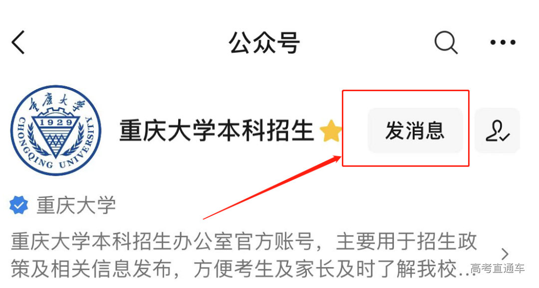 关注【重庆大学本科招生】微信公众号,点击【发消息】进入菜单页面。