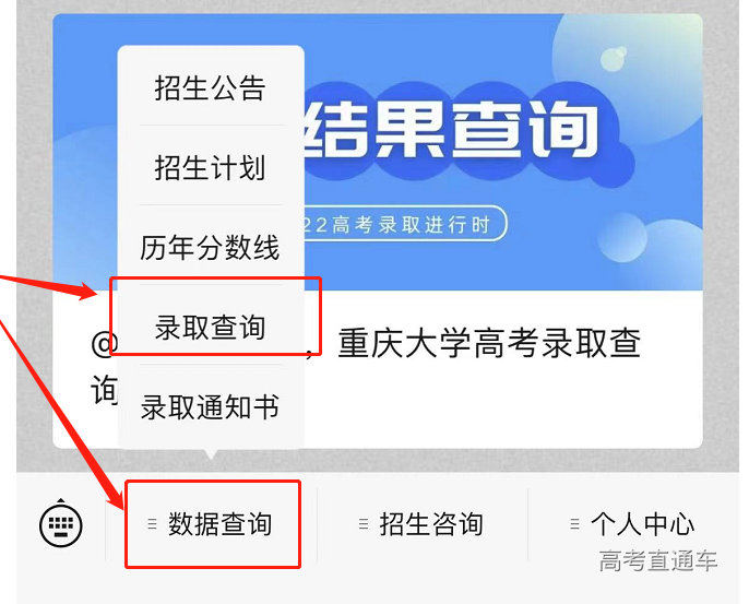 在底部菜单栏找到【数据查询】,点击后选择【录取查询】即可跳转至查询页面。