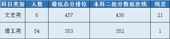 录取快讯:【湖北省】已录取结束,原计划数30人,实际录取30人,其中理科计划26人,实际录取26人,最低录取分为439分,高出省控线51分,热门专业为网络工程;文科计划4人,实际录取4人,最低录取分为463分,高出省控线18分,文科热门专业为日语、税收学。