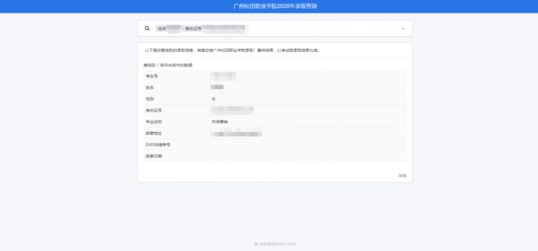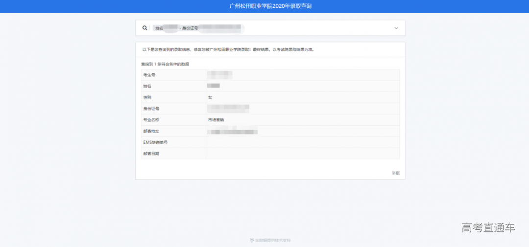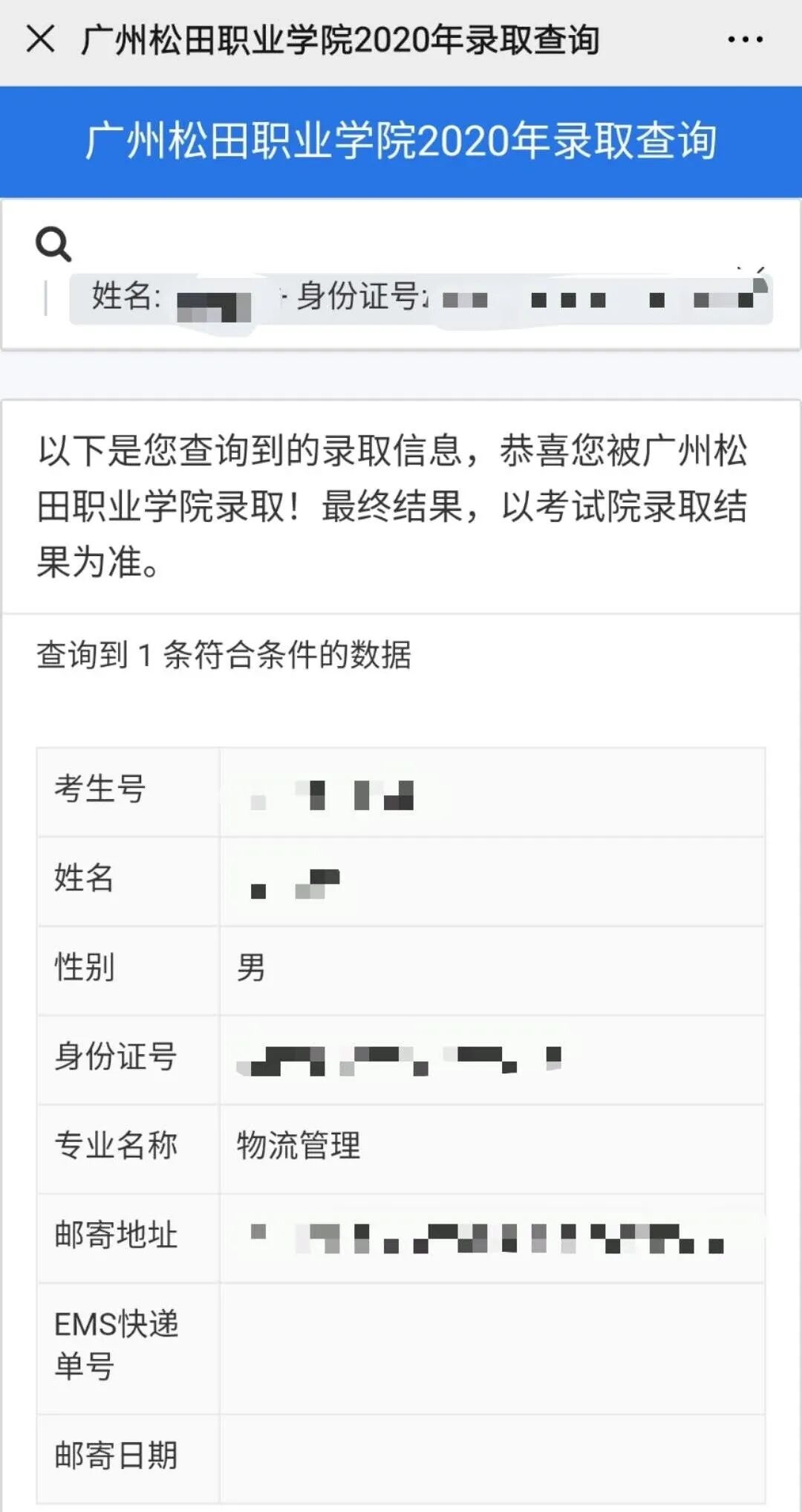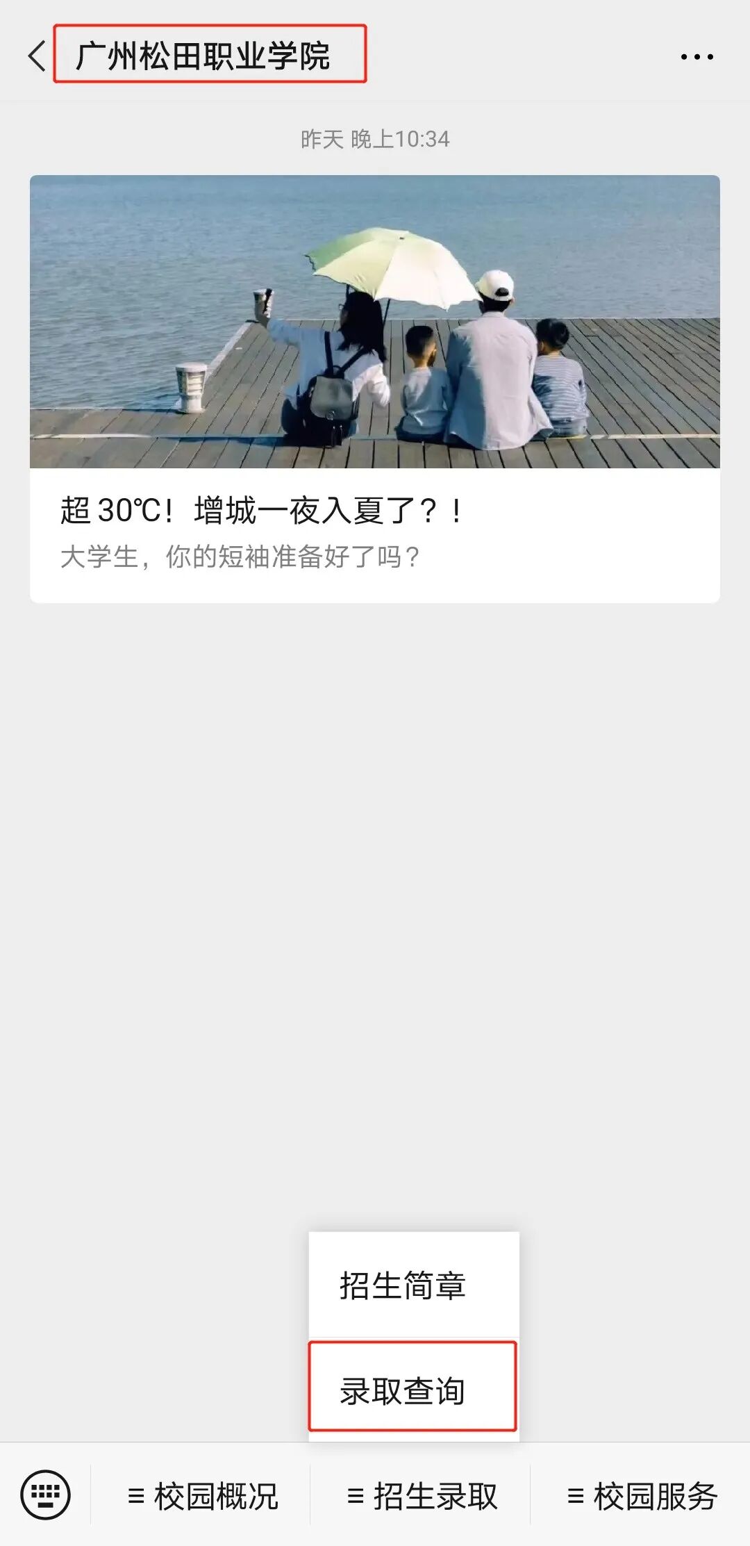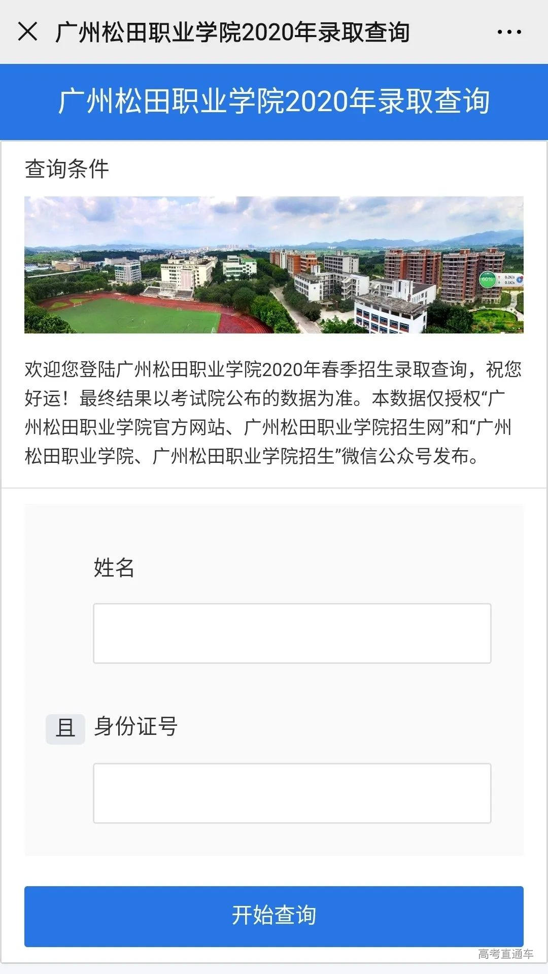 在微信搜索并关注公众号“广州松田职业学院”,点击下拉菜单招生录取→录取查询