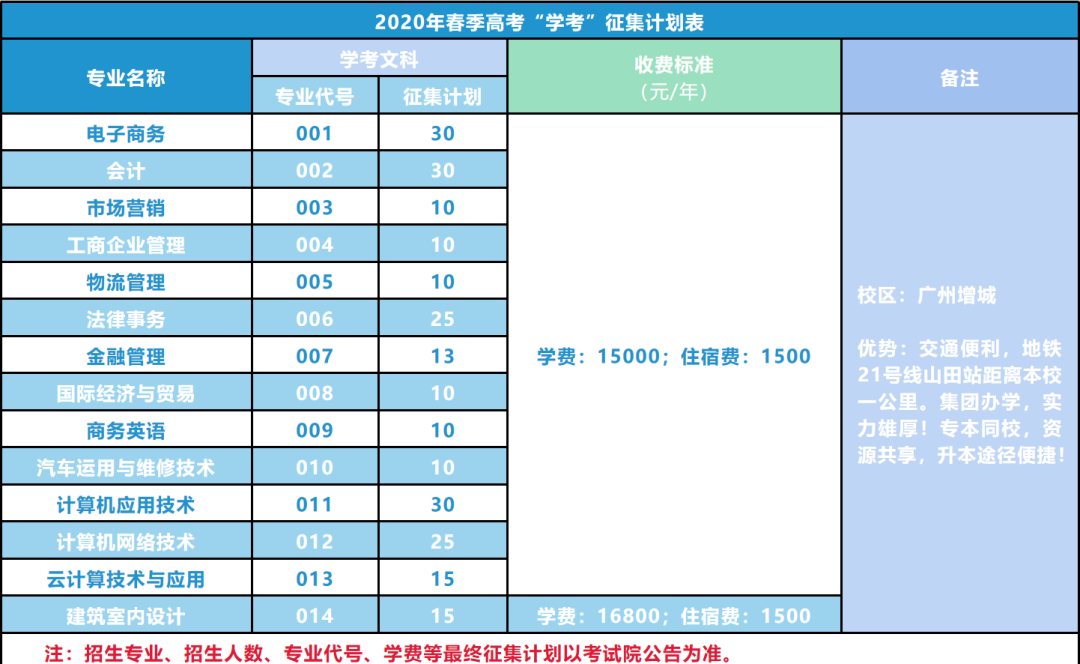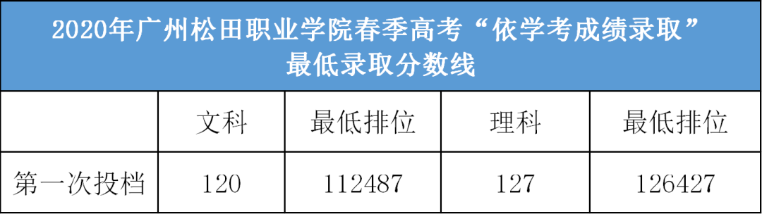 我校2020年春季高考“依学考成绩录取”第一次投档录取结束,其中文科最高分222,最低分120 ,尚有部分计划参与征集!理科最高分232,最低分127,理科计划已完成,无需参加征集!