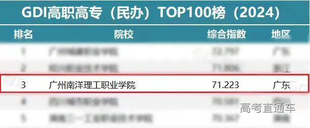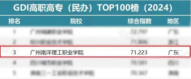 在2024年GDI高职高专排行榜中,位列全国民办高职高专院校第3名、广东省第2名;