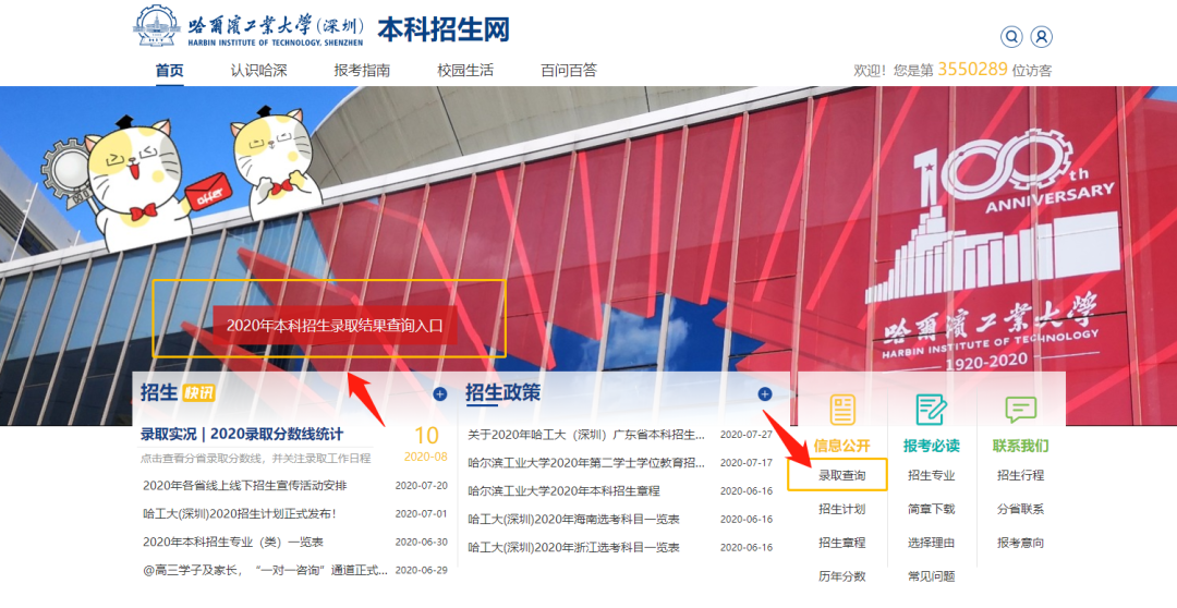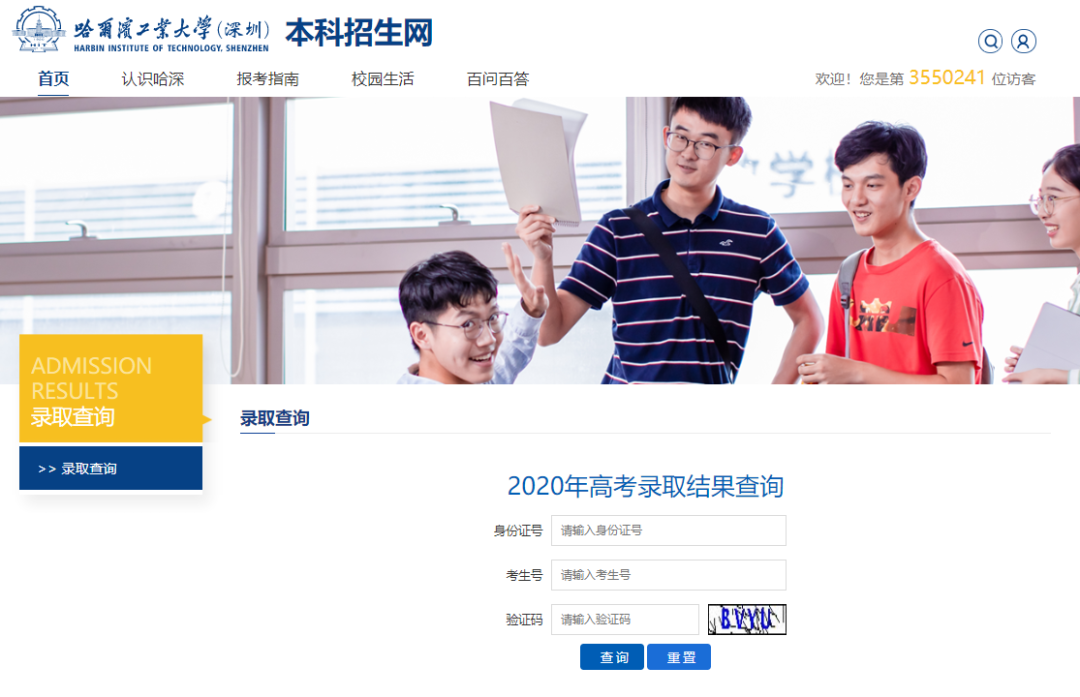 进入哈尔滨工业大学(深圳)本科招生网:http://zsb.hitsz.edu.cn/bzs/zswz,根据下图红色箭头指引可快捷访问录取结果查询入口和高考录取日程。首页招生快讯版块中的“录取实况统计”,也将实时更新各省录取最低分数线,敬请关注。 进入录取查询页面后,请考生和家长关注下方的2020年录取进程提示,待考生所在省进程状态变为“录取结束、可查询结果”时,可正常查询录取结果(具体录取进度以网页更新为准)。