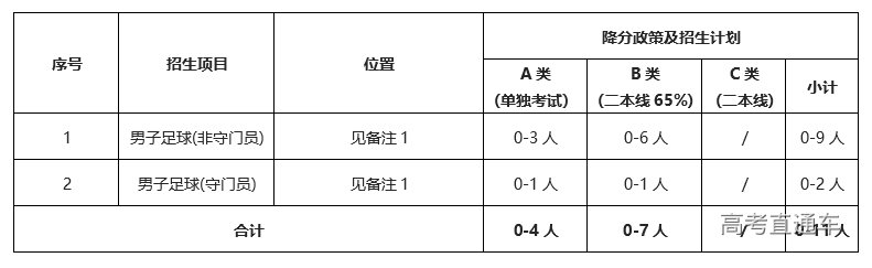 (1)男子足球(非守门员)A类招收前锋、前卫,B类招收前卫、后卫;男子足球均不招收以五人制足球等级证书或比赛获奖报名的考生。