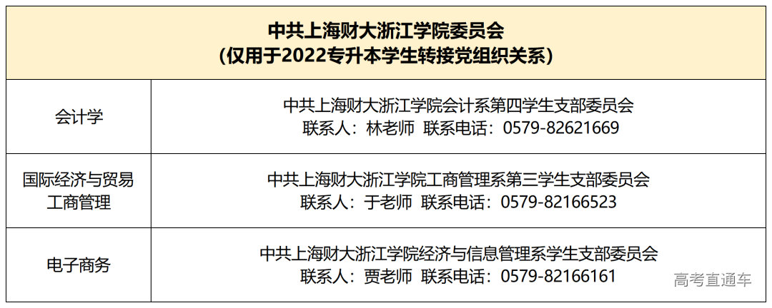 接收地址: 浙江省金华市金东区环城南路99号 上海财经大学浙江学院 接收部门:招生就业处办公室 接收电话:0579-82166011 备注信息:2022级专升本新生档案+录取专业 温馨提示:为确保新生个人档案顺利送达,请于暑假期间,由生源所在学校通过机要或EMS邮政速递形式直接寄送至我院招生就业处办公室,其他邮递方式概不接收。 党团组织关系转接 党组织关系: 被我校拟录取的“专升本”学生,如果是学生党员,均应按照党员管理的规定,由原所在党组织在全国党员管理信息系统中提出网上转接申请,无需开具纸质介绍信,各专业接收单位如下:
