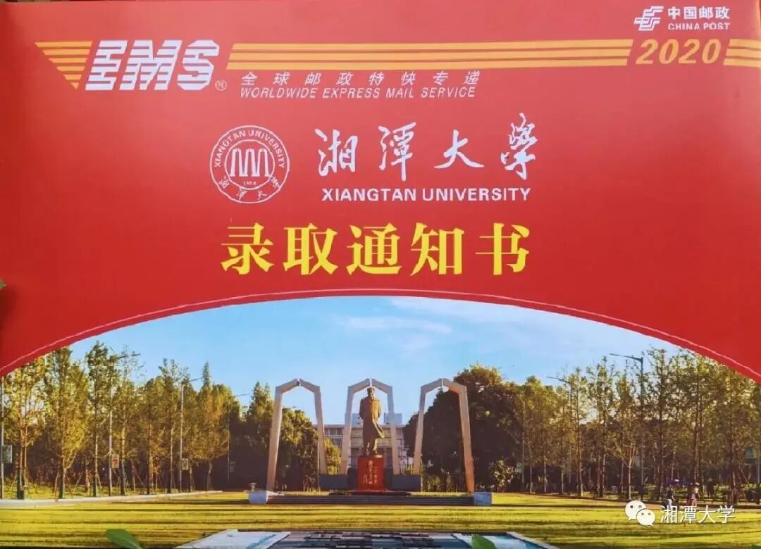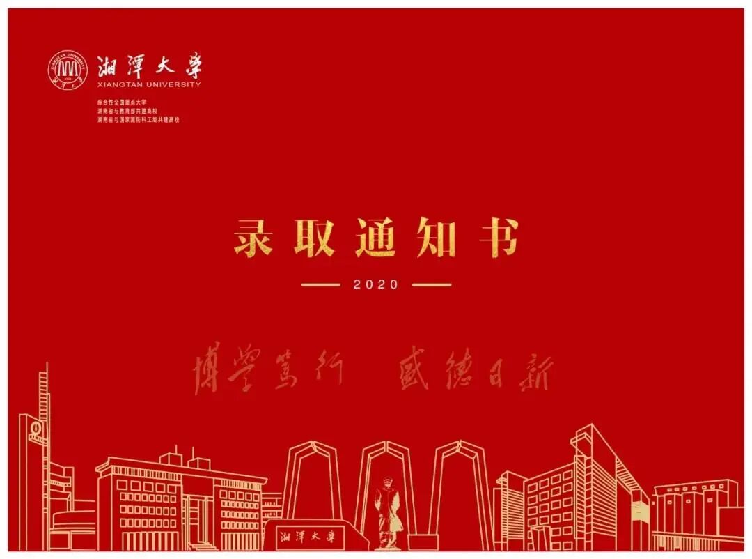 湘潭大学录取通知书以红色为底,寓意“传承红色基因,以红色文化立德树人”。上部湘潭大学logo(校名、校徽);中部为烫金“录取通知书”,校训“博学笃行,盛德日新”;底部是湘潭大学主要标志性建筑,包括:湘潭大学南校门“三道拱门”、毛泽东主席铜像、湘潭大学图书馆、学生活动中心、信息楼等。
