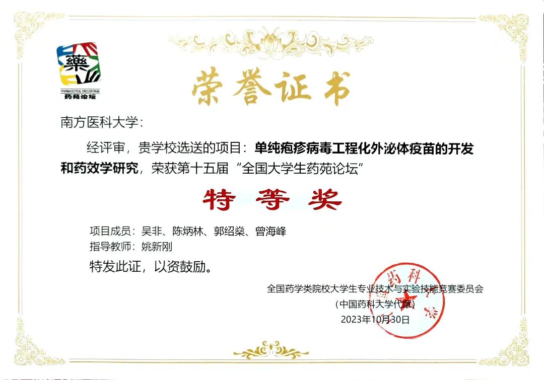 学生获第十五届”中国大学生药苑论坛“特等奖