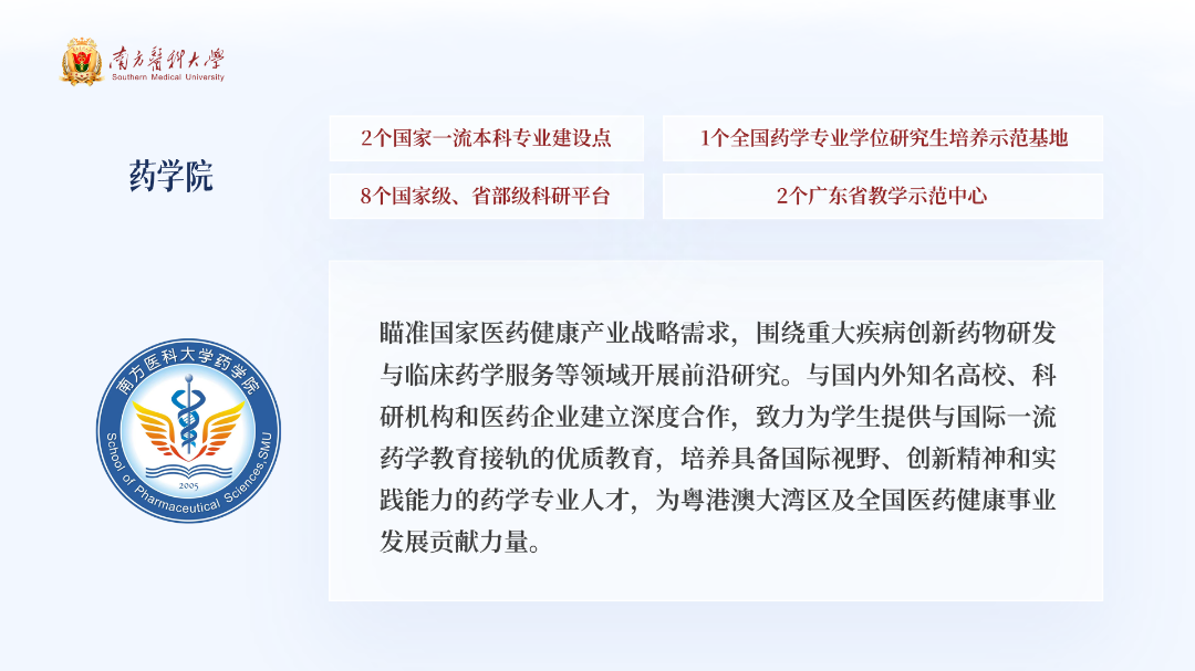 南方医科大学药学院是南方医科大学首批“试点学院”之一,2010年全面试行学术负责人制(PI制),目前全院正实施第三轮PI制和新型本科教学管理体制。药理与毒理学学科ESI排名全球前0.51‰,化学学科ESI排名全球前0.48%,材料科学学科ESI排名全球前0.38%。学院秉承“创新引领发展,特色成就卓越”的理念,以特色内涵建设、教学模式改革、多元协同创新发展以及体制机制创新“四位一体”的改革目标为使命,更新理念,整合资源,汇聚人才,为跻身中国高校最优秀的药学院行列而奋斗。