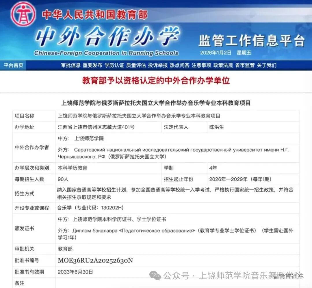 2025年12月31日,教育部正式批准我院与俄罗斯萨拉托夫国立大学合作举办音乐学本科教育项目。这是我校首次获批的中外合作办学项目之一,标志着学校国际化办学与内涵式发展取得重大突破。
