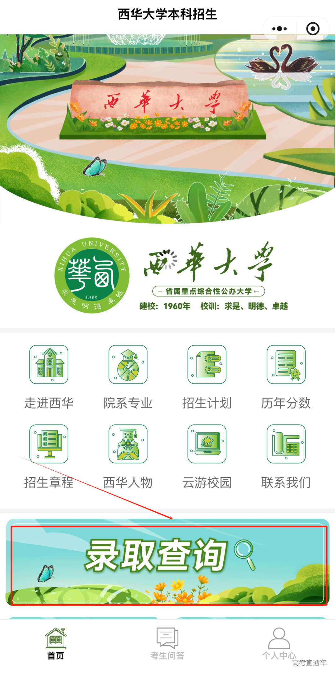 搜索“西华大学本科招生”微信小程序 点击下方【录取查询】