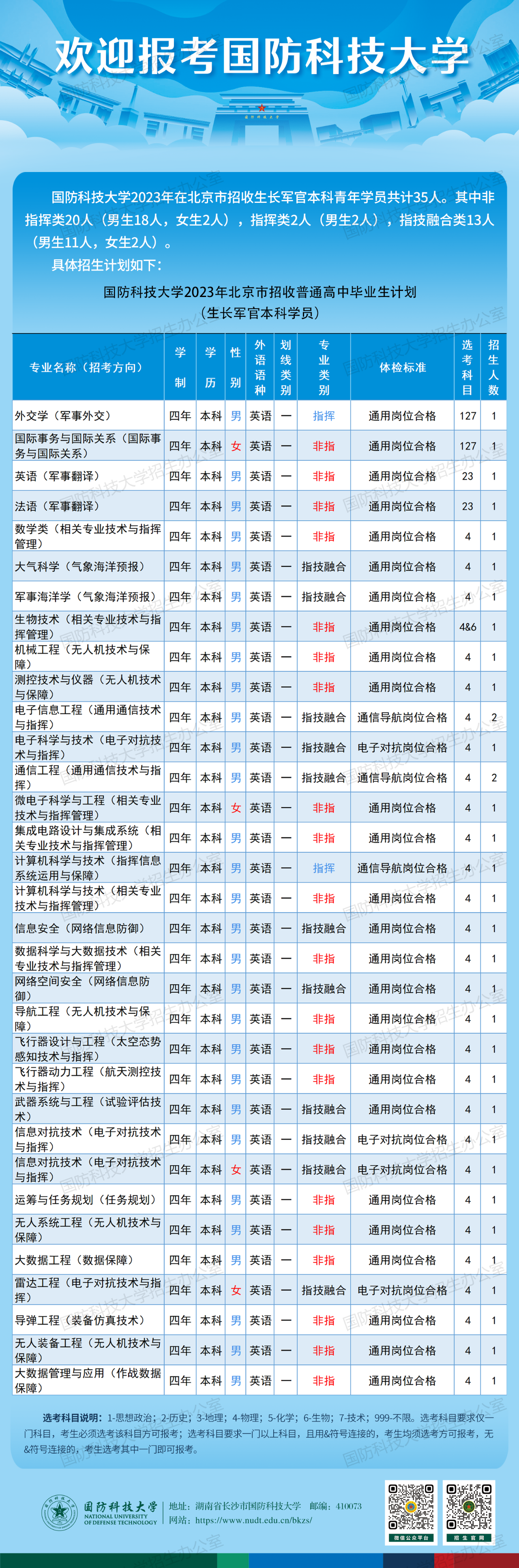 国防科技大学2023年生长军官本科学员招生计划(北京)