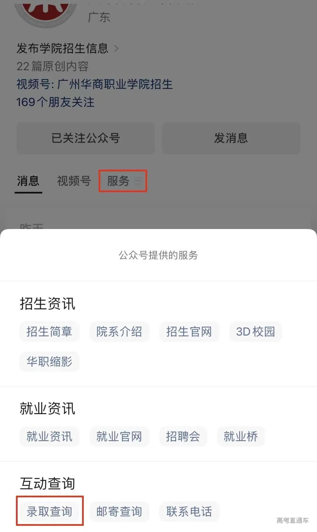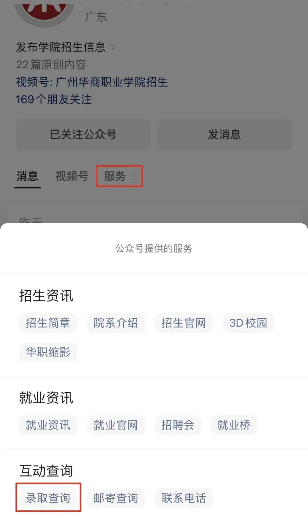 官微查询 1.关注我校官方微信公众号“广州华商职业学院招生办公室” 方式一:点击上方公众号卡片,进入后点击服务→互动查询→录取查询