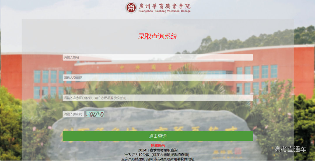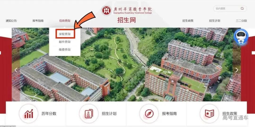 2. 进入广州华商职业学院招生网→点击信息查询→录取查询→输入姓名、身份证号、准考证号(10位数,可在志愿填报系统查询)和验证码,点击查询录取信息。