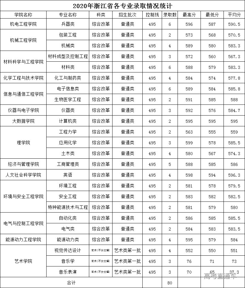 2020年中北大学在浙江省分专业录取分数线