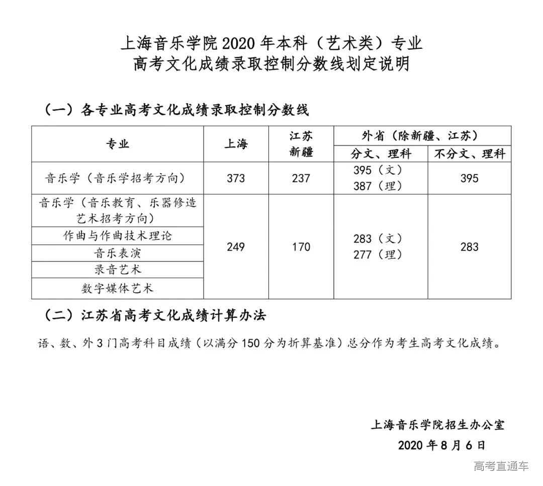 2020年上海音乐学院本科(艺术类)专业高考文化成绩录取分数线