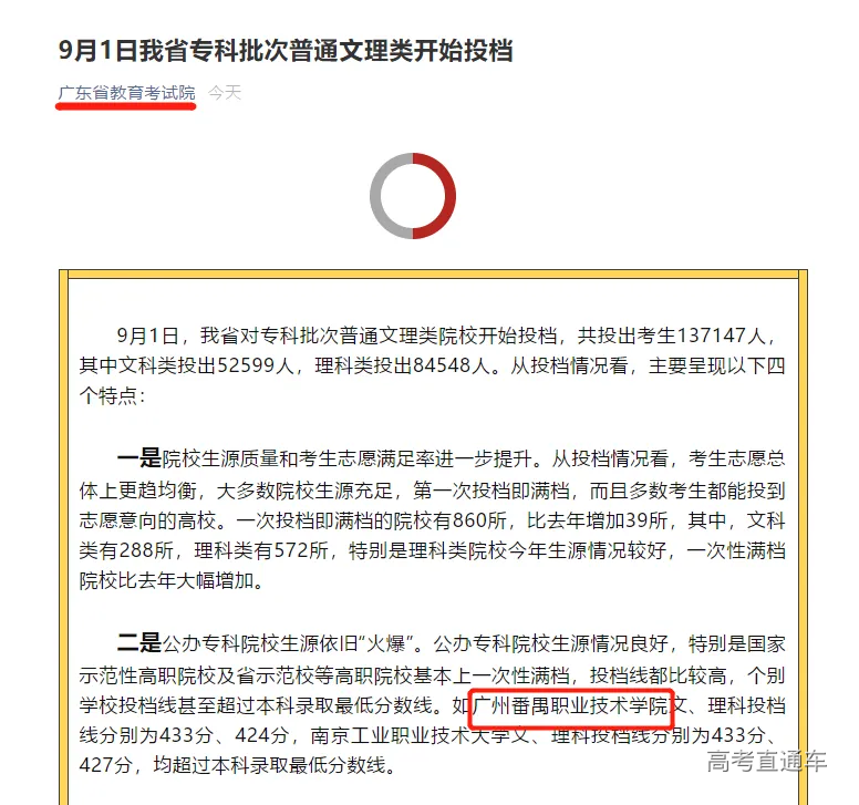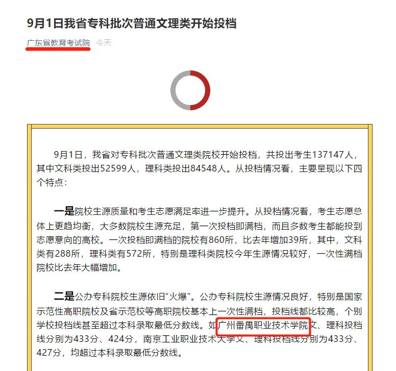 在文理类投档中因生源火爆,我校作为唯一一所广东省公办专科院校,被广东省教育考试院微信公众号微文“官宣”了。番职能有这个荣誉,全靠广大考生的喜爱和追捧,在这里谢谢广大考生对番职的喜爱。