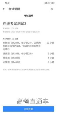 (若人脸识别失败三次,可继续进行考试,由监考人员进行人工比对或接受监考人员询问),等待考试开始即可。到达考试开始时间,点击页面底部“进入考试”按钮,进入“考试说明”页面(见图5),阅读考试说明,点击“开始答题”按钮即可开始考试。