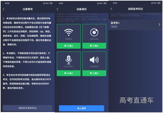 (二)考生须考前60分钟用考试手机登录“讯飞智教学”APP->“AI考试”,用监考手机登录“讯飞智教学”APP->“AI监考”,检查整个考试环境是否符合考试要求,并等待正式开考。因考生考试环境不符合要求,后果由考生本人负责。