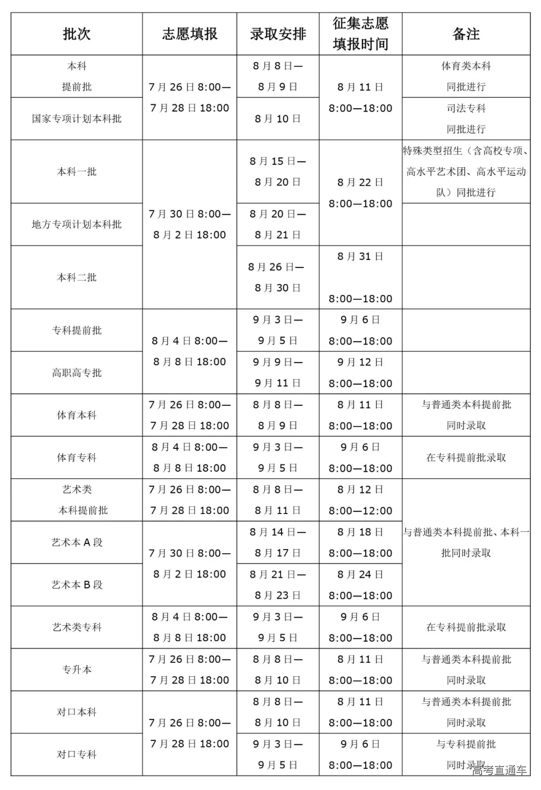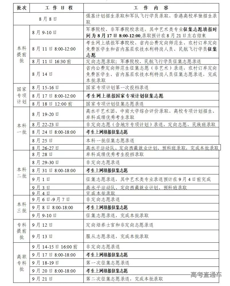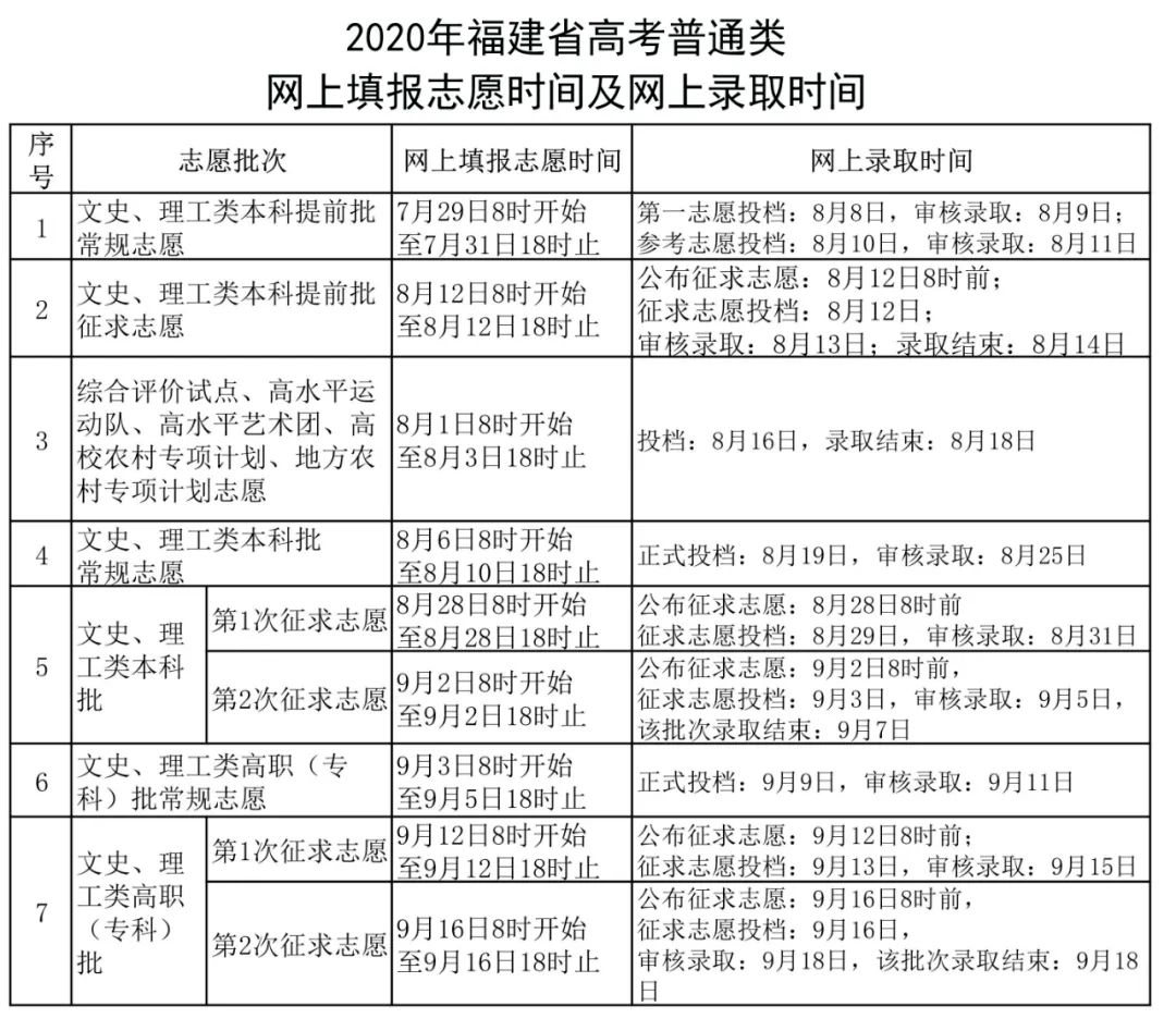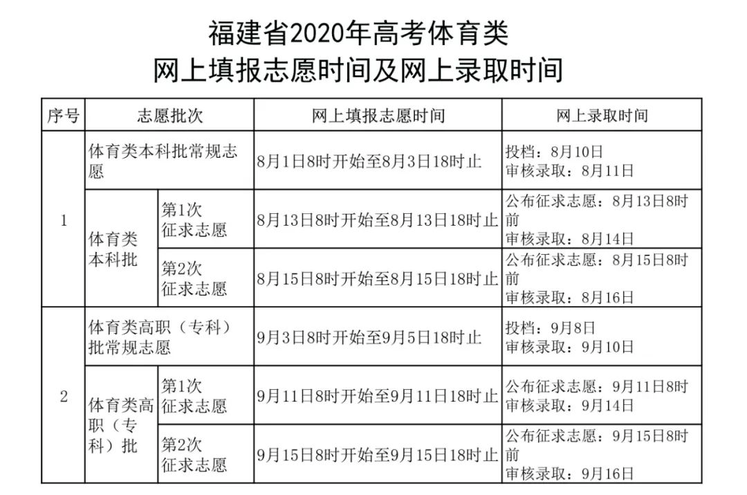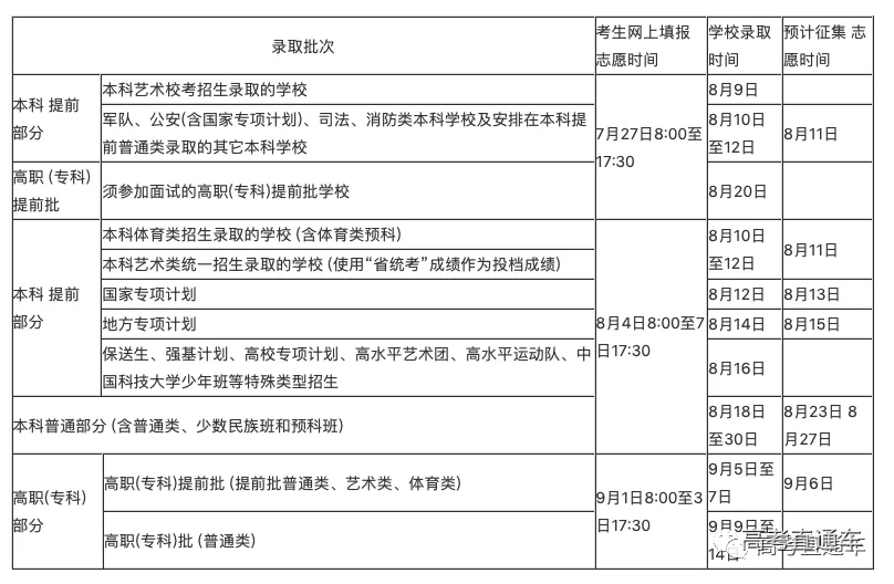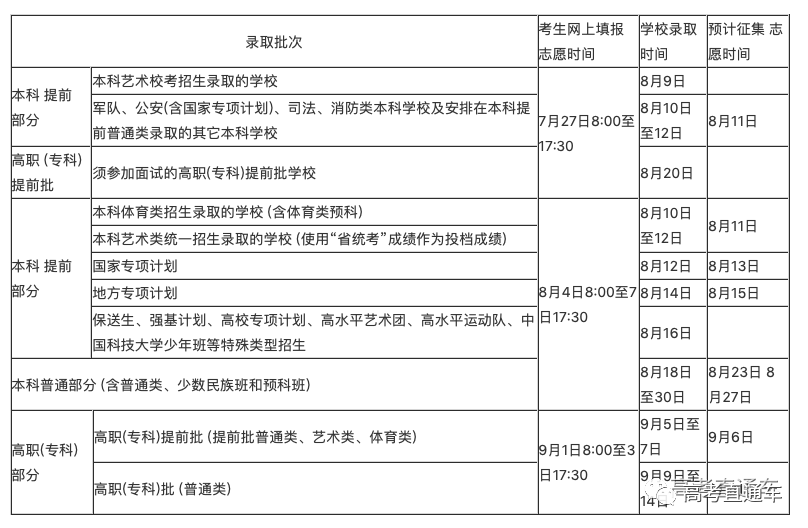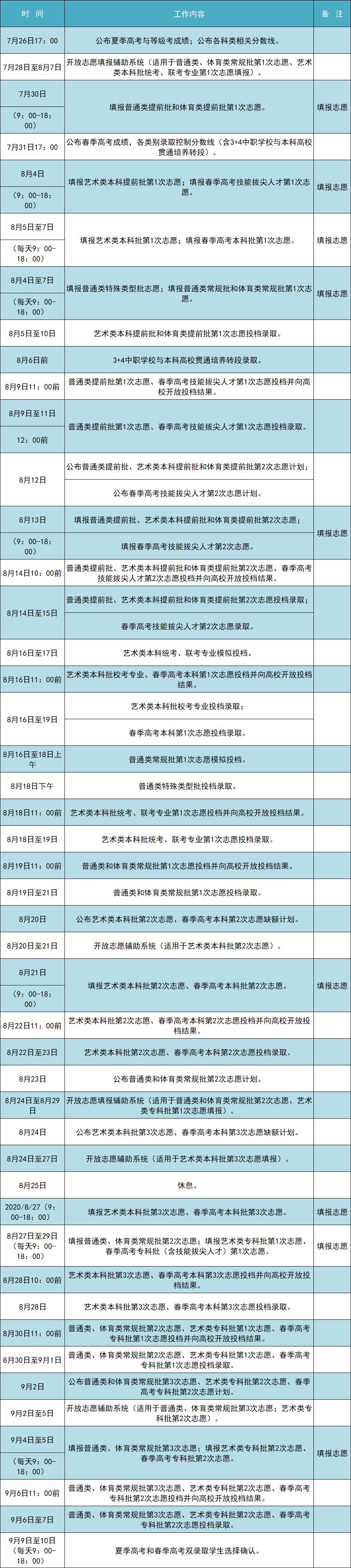 2020年全国各省市高考录取日程 01 广东高考录取 日程 02 福建高考录取 日程 (上下滑动查看) 03 四川高考录取 日程 (上下滑动查看) 一、各批次录取开始时间(普通类) 8月6日上午:空军、海军、民航招飞 8月6日上午:本科提前批国家专项、免费医学定向 8月9日下午:本科提前批 8月14日中午:国家专项计划 8月16日中午:地方专项计划 8月17日上午:深贫县帮扶专项计划 8月21日下午:本科第一批 8月22日晚上:一类模式本科第一批 8月23日下午:对口招生本科 8月26日中午:深贫县普通类本科和省级公费师范生本科 8月30日中午:对口招生免费医学定向 8月31日下午:本科第二批 9月2日上午:一类模式本科第二批 9月4日中午:对口招生专科 9月10日上午:专科提前批 9月13日上午:深贫县普通类专科、本土人才培养专项专科 9月16日上午:专科批 9月17日晚上:一类模式专科批 9月20日:“1+2” 二、各批次征集志愿日期(普通类)(具体时间另文通知) 8月8日上午:本科提前批国家专项、免费医学定向 8月13日:本科提前批 8月15日上午:国家专项计划 8月23日:本科第一批(含国家专项计划、地方专项计划、深贫县帮扶专项计划) 8月24日:一类模式本科第一批 8月25日:对口招生本科 8月27日:深贫县普通类本科和省级公费师范生本科 9月4日:本科第二批 9月5日:一类模式本科第二批 9月6日:对口招生专科 9月11日:专科提前批 9月13日:深贫县普通类专科、本土人才培养专项专科 9月18日:专科批 9月19日:一类模式专科批 三、各批次录取开始时间(艺体类) 8月8日上午:艺术类本科提前批 8月16日上午:深贫计划本科、省级公费师范生本科 8月20日晚上:艺术类本科第一批、体育类本科批 8月28日上午:艺术类本科第二批 9月1日上午:深贫计划专科、省级公费师范生专科、本土人才培养专科 9月5日晚上:艺术体育类专科批 四、各批次征集志愿日期(艺体类)(具体时间另文通知) 8月14日:艺术类本科提前批 8月16日下午:深贫计划本科、省级公费师范生本科第一次征集志愿 8月17日下午:深贫计划本科、省级公费师范生本科第二次征集志愿 8月24日:艺术类本科第一批、体育类本科批第一次征集志愿 8月26日:艺术类本科第一批、体育类本科批第二次征集志愿 8月28日下午:艺术类本科第二批 9月1日下午:深贫计划专科、省级公费师范生专科、本土人才培养专科第一次征集志愿 9月2日下午:深贫计划专科、省级公费师范生专科、本土人才培养专科第二次征集志愿 9月7日下午:艺术体育类专科批第一次征集志愿 9月9日上午:艺术体育类专科批第二次征集志愿 04 浙江高考录取 日程 (上下滑动查看) 7月26日左右 公布分段线,成绩一分一段表,提供考生成绩、位次号查询。向强基计划学校提供入围考生的高考分数、体检信息、一段线。 7月29日8:30—7月30日17:30 符合要求考生填报提前录取院校、第一段平行录取志愿、高校专项、高水平艺术团、高水平运动队志愿,地方专项志愿。 7月31日—8月8日 军检、政审。 8月5日 强基计划录取 8月7日前 高水平三位一体录取 (一)普通类提前录取 浙江警察学院投档 8月8日8:30 浙江警察学院退档、录取 8月8日16:30 第一段: 第一志愿投档 8月11日8:30 退档录检结束 8月11日16:30 第二志愿投档 8月12日8:30 退档录检结束 8月12日11:00 第三志愿投档 8月12日14:30 退档录检结束 8月12日16:30 第四志愿投档 8月13日8:30 退档录检结束 8月13日11:00 第五志愿投档 8月13日14:30 退档录检结束 8月13日16:30 军校征求志愿 8月14日上午 军校征求志愿投档 8月14日14:00 军校征求志愿录取 8月14日17:00 第二段: 第一志愿投档 8月15日8:30 退档录检结束 8月15日16:30 第二志愿投档 8月16日8:30 退档录检结束 8月16日11:00 第三志愿投档 8月16日14:30 退档录检结束 8月16日16:30 第四志愿投档 8月17日8:30 退档录检结束 8月17日10:00 第五志愿投档 8月17日10:30 退档录检结束 8月17日12:00 第三段: 第一志愿投档 8月18日8:30 退档录检结束 8月18日16:30 第二志愿投档 8月19日8:30 退档录检结束 8月19日11:00 第三志愿投档 8月19日14:30 退档录检结束 8月19日16:30 第四志愿投档 8月20日8:30 退档录检结束 8月20日10:00 第五志愿投档 8月20日10:30 退档录检结束 8月20日12:00 高校专项及高水平艺术团招生投档 8月15日8:30 高水平运动队招生投档 8月15日10:00 地方专项计划招生投档 8月15日14:30 (二)普通类平行录取 第一段平行投档录取: 向院校提供模拟投档情况 8月16日20:30 平行志愿投档 8月19日8:30 退档录检结束 8月20日16:30 公布剩余计划 8月22日上午 第二段志愿填报: 8月25日8:30—8月26日17:30 第二段平行投档录取: 向院校提供模拟投档情况 8月28日20:30 平行志愿投档 8月30日8:30 退档录检结束 8月31日16:30 公布剩余计划 9月2日上午 第三段志愿填报: 9月5日8:30—9月6日17:30 第三段平行投档录取: 向院校提供模拟投档情况 9月8日20:30 平行志愿投档 9月10日8:30 退档录检结束 9月11日16:30 公布征求计划 9月13日上午 征求志愿填报: 9月14日8:30—17:30 征求志愿投档录取: 征求志愿投档 9月16日8:30 退档录检结束 9月16日16:30 7月26日左右 公布艺术类分段线,成绩一分一段表,提供艺术类考生综合分成绩、位次号查询。 7月29日8:30—7月30日17:30 符合要求考生填报艺术类第一批及三位一体招生院校、第二批第一段平行投档志愿。 (一)艺术类三位一体招生 提供志愿考生信息 7月31日8:30 三位一体招生录取结束 7月31 日16: