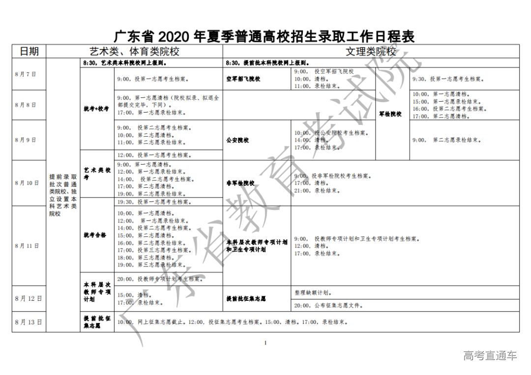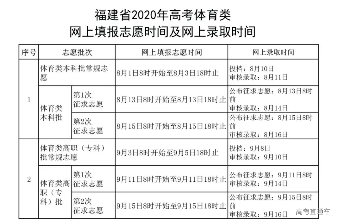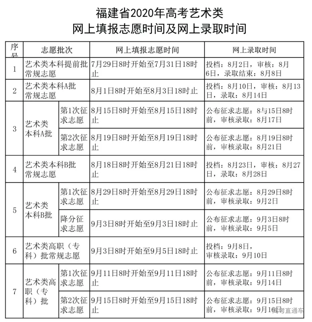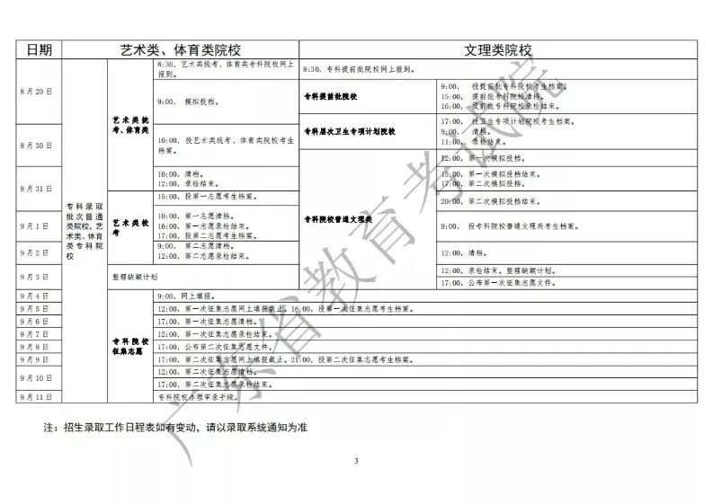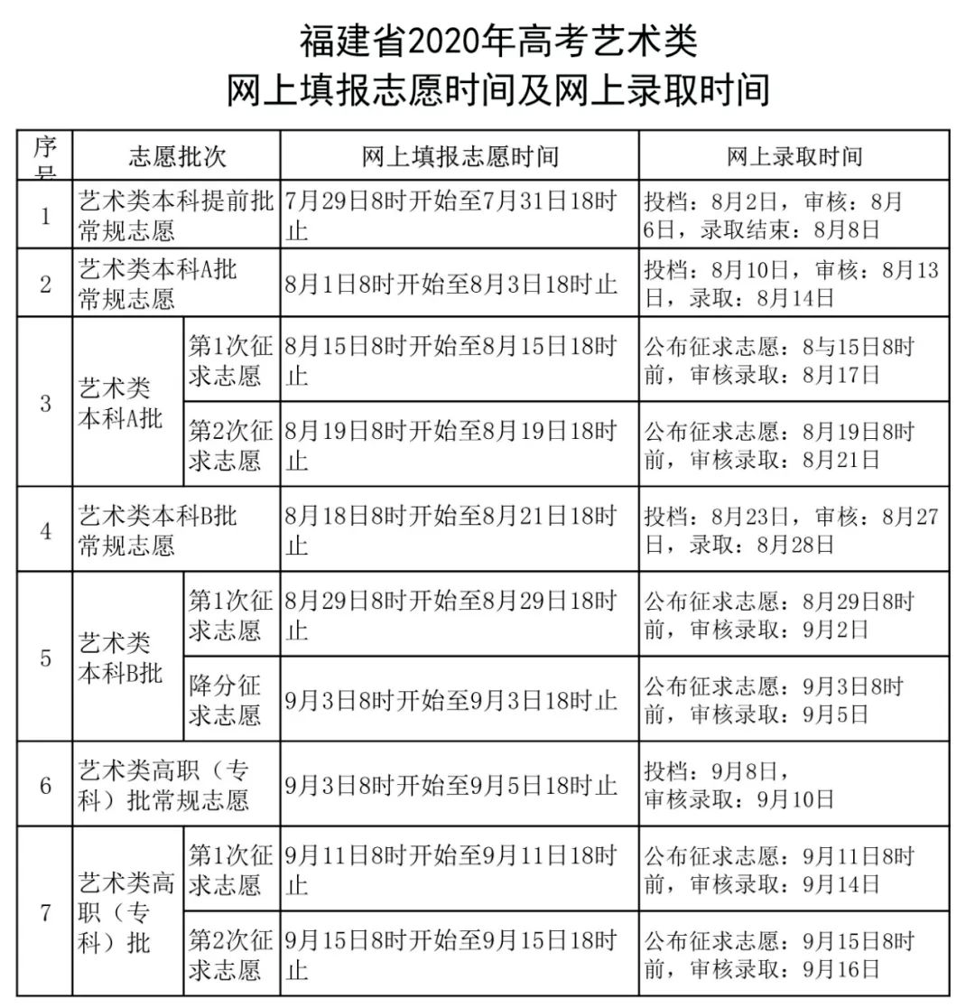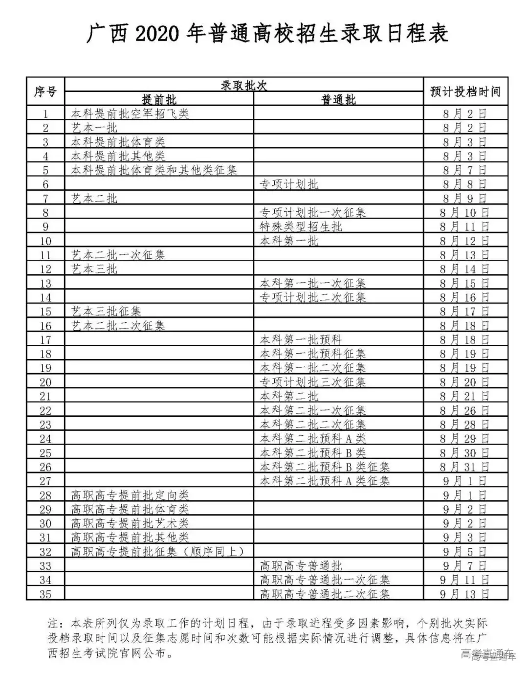 2020年全国各省市高考录取日程 01 广东高考录取 日程 02 福建高考录取 日程 (上下滑动查看) 03 四川高考录取 日程 (上下滑动查看) 一、各批次录取开始时间(普通类) 8月6日上午:空军、海军、民航招飞 8月6日上午:本科提前批国家专项、免费医学定向 8月9日下午:本科提前批 8月14日中午:国家专项计划 8月16日中午:地方专项计划 8月17日上午:深贫县帮扶专项计划 8月21日下午:本科第一批 8月22日晚上:一类模式本科第一批 8月23日下午:对口招生本科 8月26日中午:深贫县普通类本科和省级公费师范生本科 8月30日中午:对口招生免费医学定向 8月31日下午:本科第二批 9月2日上午:一类模式本科第二批 9月4日中午:对口招生专科 9月10日上午:专科提前批 9月13日上午:深贫县普通类专科、本土人才培养专项专科 9月16日上午:专科批 9月17日晚上:一类模式专科批 9月20日:“1+2” 二、各批次征集志愿日期(普通类)(具体时间另文通知) 8月8日上午:本科提前批国家专项、免费医学定向 8月13日:本科提前批 8月15日上午:国家专项计划 8月23日:本科第一批(含国家专项计划、地方专项计划、深贫县帮扶专项计划) 8月24日:一类模式本科第一批 8月25日:对口招生本科 8月27日:深贫县普通类本科和省级公费师范生本科 9月4日:本科第二批 9月5日:一类模式本科第二批 9月6日:对口招生专科 9月11日:专科提前批 9月13日:深贫县普通类专科、本土人才培养专项专科 9月18日:专科批 9月19日:一类模式专科批 三、各批次录取开始时间(艺体类) 8月8日上午:艺术类本科提前批 8月16日上午:深贫计划本科、省级公费师范生本科 8月20日晚上:艺术类本科第一批、体育类本科批 8月28日上午:艺术类本科第二批 9月1日上午:深贫计划专科、省级公费师范生专科、本土人才培养专科 9月5日晚上:艺术体育类专科批 四、各批次征集志愿日期(艺体类)(具体时间另文通知) 8月14日:艺术类本科提前批 8月16日下午:深贫计划本科、省级公费师范生本科第一次征集志愿 8月17日下午:深贫计划本科、省级公费师范生本科第二次征集志愿 8月24日:艺术类本科第一批、体育类本科批第一次征集志愿 8月26日:艺术类本科第一批、体育类本科批第二次征集志愿 8月28日下午:艺术类本科第二批 9月1日下午:深贫计划专科、省级公费师范生专科、本土人才培养专科第一次征集志愿 9月2日下午:深贫计划专科、省级公费师范生专科、本土人才培养专科第二次征集志愿 9月7日下午:艺术体育类专科批第一次征集志愿 9月9日上午:艺术体育类专科批第二次征集志愿 04 浙江高考录取 日程 (上下滑动查看) 7月26日左右 公布分段线,成绩一分一段表,提供考生成绩、位次号查询。向强基计划学校提供入围考生的高考分数、体检信息、一段线。 7月29日8:30—7月30日17:30 符合要求考生填报提前录取院校、第一段平行录取志愿、高校专项、高水平艺术团、高水平运动队志愿,地方专项志愿。 7月31日—8月8日 军检、政审。 8月5日 强基计划录取 8月7日前 高水平三位一体录取 (一)普通类提前录取 浙江警察学院投档 8月8日8:30 浙江警察学院退档、录取 8月8日16:30 第一段: 第一志愿投档 8月11日8:30 退档录检结束 8月11日16:30 第二志愿投档 8月12日8:30 退档录检结束 8月12日11:00 第三志愿投档 8月12日14:30 退档录检结束 8月12日16:30 第四志愿投档 8月13日8:30 退档录检结束 8月13日11:00 第五志愿投档 8月13日14:30 退档录检结束 8月13日16:30 军校征求志愿 8月14日上午 军校征求志愿投档 8月14日14:00 军校征求志愿录取 8月14日17:00 第二段: 第一志愿投档 8月15日8:30 退档录检结束 8月15日16:30 第二志愿投档 8月16日8:30 退档录检结束 8月16日11:00 第三志愿投档 8月16日14:30 退档录检结束 8月16日16:30 第四志愿投档 8月17日8:30 退档录检结束 8月17日10:00 第五志愿投档 8月17日10:30 退档录检结束 8月17日12:00 第三段: 第一志愿投档 8月18日8:30 退档录检结束 8月18日16:30 第二志愿投档 8月19日8:30 退档录检结束 8月19日11:00 第三志愿投档 8月19日14:30 退档录检结束 8月19日16:30 第四志愿投档 8月20日8:30 退档录检结束 8月20日10:00 第五志愿投档 8月20日10:30 退档录检结束 8月20日12:00 高校专项及高水平艺术团招生投档 8月15日8:30 高水平运动队招生投档 8月15日10:00 地方专项计划招生投档 8月15日14:30 (二)普通类平行录取 第一段平行投档录取: 向院校提供模拟投档情况 8月16日20:30 平行志愿投档 8月19日8:30 退档录检结束 8月20日16:30 公布剩余计划 8月22日上午 第二段志愿填报: 8月25日8:30—8月26日17:30 第二段平行投档录取: 向院校提供模拟投档情况 8月28日20:30 平行志愿投档 8月30日8:30 退档录检结束 8月31日16:30 公布剩余计划 9月2日上午 第三段志愿填报: 9月5日8:30—9月6日17:30 第三段平行投档录取: 向院校提供模拟投档情况 9月8日20:30 平行志愿投档 9月10日8:30 退档录检结束 9月11日16:30 公布征求计划 9月13日上午 征求志愿填报: 9月14日8:30—17:30 征求志愿投档录取: 征求志愿投档 9月16日8:30 退档录检结束 9月16日16:30 7月26日左右 公布艺术类分段线,成绩一分一段表,提供艺术类考生综合分成绩、位次号查询。 7月29日8:30—7月30日17:30 符合要求考生填报艺术类第一批及三位一体招生院校、第二批第一段平行投档志愿。 (一)艺术类三位一体招生 提供志愿考生信息 7月31日8:30 三位一体招生录取结束 7月31 日16: