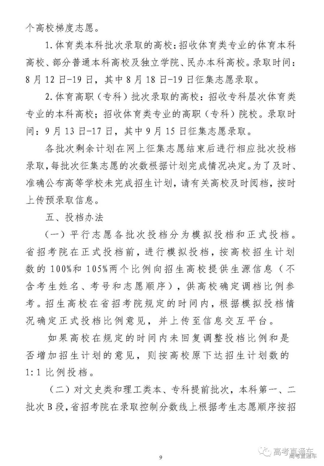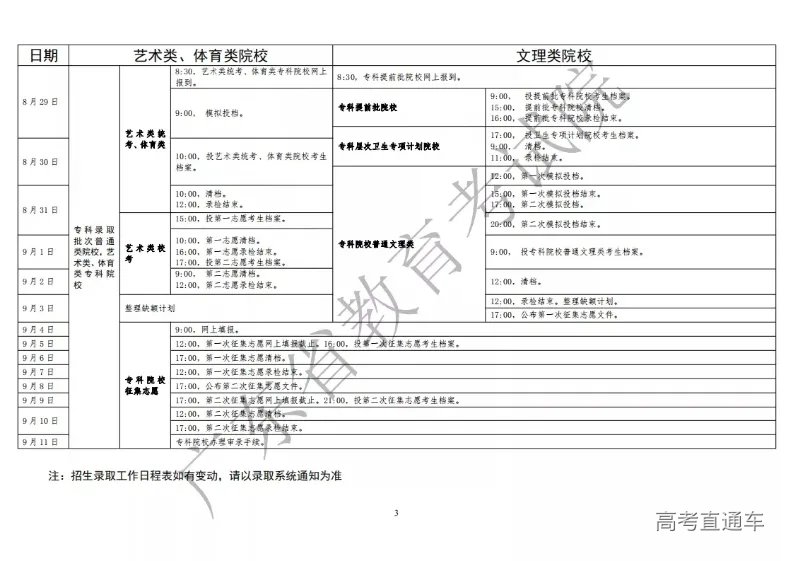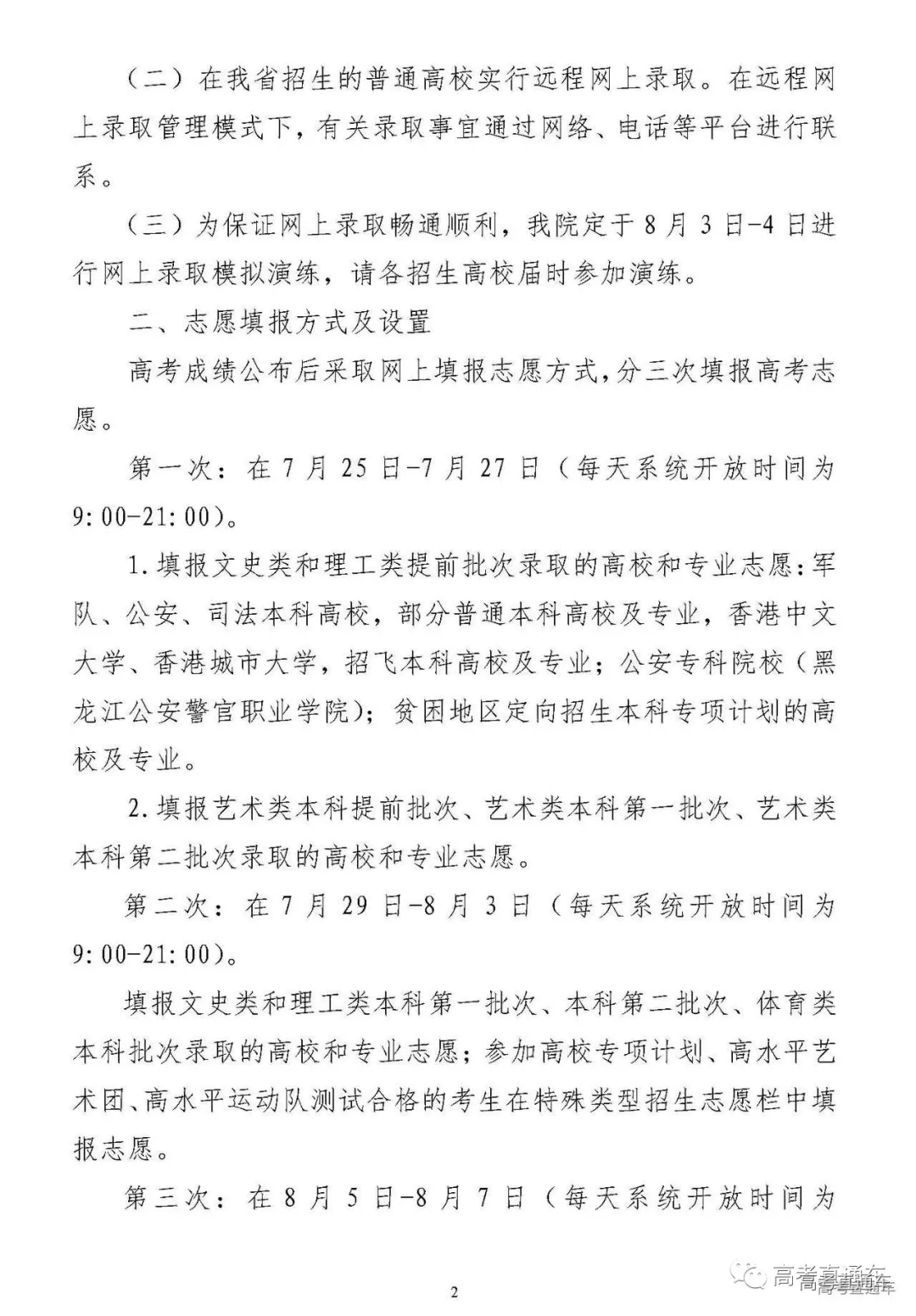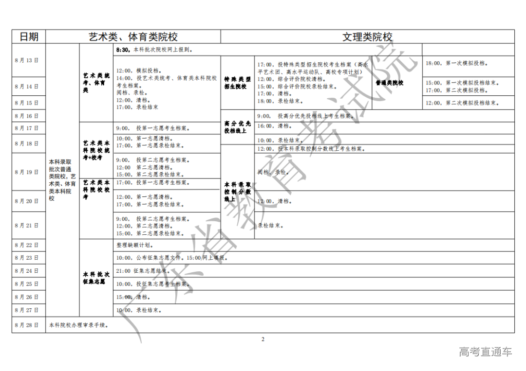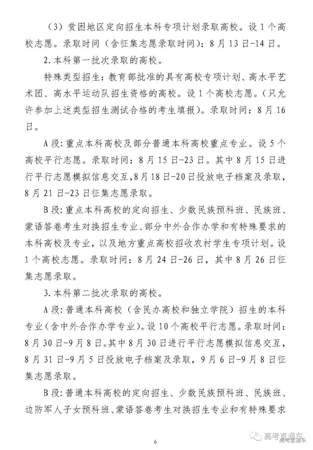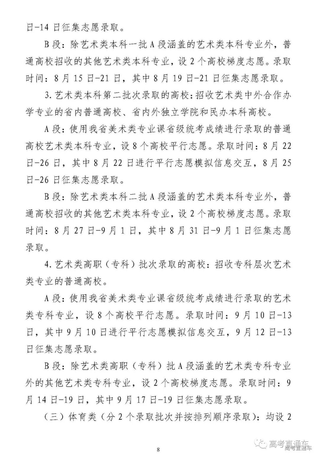 2020年全国各省市高考录取日程 01 广东高考录取 日程 02 福建高考录取 日程 (上下滑动查看) 03 四川高考录取 日程 (上下滑动查看) 一、各批次录取开始时间(普通类) 8月6日上午:空军、海军、民航招飞 8月6日上午:本科提前批国家专项、免费医学定向 8月9日下午:本科提前批 8月14日中午:国家专项计划 8月16日中午:地方专项计划 8月17日上午:深贫县帮扶专项计划 8月21日下午:本科第一批 8月22日晚上:一类模式本科第一批 8月23日下午:对口招生本科 8月26日中午:深贫县普通类本科和省级公费师范生本科 8月30日中午:对口招生免费医学定向 8月31日下午:本科第二批 9月2日上午:一类模式本科第二批 9月4日中午:对口招生专科 9月10日上午:专科提前批 9月13日上午:深贫县普通类专科、本土人才培养专项专科 9月16日上午:专科批 9月17日晚上:一类模式专科批 9月20日:“1+2” 二、各批次征集志愿日期(普通类)(具体时间另文通知) 8月8日上午:本科提前批国家专项、免费医学定向 8月13日:本科提前批 8月15日上午:国家专项计划 8月23日:本科第一批(含国家专项计划、地方专项计划、深贫县帮扶专项计划) 8月24日:一类模式本科第一批 8月25日:对口招生本科 8月27日:深贫县普通类本科和省级公费师范生本科 9月4日:本科第二批 9月5日:一类模式本科第二批 9月6日:对口招生专科 9月11日:专科提前批 9月13日:深贫县普通类专科、本土人才培养专项专科 9月18日:专科批 9月19日:一类模式专科批 三、各批次录取开始时间(艺体类) 8月8日上午:艺术类本科提前批 8月16日上午:深贫计划本科、省级公费师范生本科 8月20日晚上:艺术类本科第一批、体育类本科批 8月28日上午:艺术类本科第二批 9月1日上午:深贫计划专科、省级公费师范生专科、本土人才培养专科 9月5日晚上:艺术体育类专科批 四、各批次征集志愿日期(艺体类)(具体时间另文通知) 8月14日:艺术类本科提前批 8月16日下午:深贫计划本科、省级公费师范生本科第一次征集志愿 8月17日下午:深贫计划本科、省级公费师范生本科第二次征集志愿 8月24日:艺术类本科第一批、体育类本科批第一次征集志愿 8月26日:艺术类本科第一批、体育类本科批第二次征集志愿 8月28日下午:艺术类本科第二批 9月1日下午:深贫计划专科、省级公费师范生专科、本土人才培养专科第一次征集志愿 9月2日下午:深贫计划专科、省级公费师范生专科、本土人才培养专科第二次征集志愿 9月7日下午:艺术体育类专科批第一次征集志愿 9月9日上午:艺术体育类专科批第二次征集志愿 04 浙江高考录取 日程 (上下滑动查看) 7月26日左右 公布分段线,成绩一分一段表,提供考生成绩、位次号查询。向强基计划学校提供入围考生的高考分数、体检信息、一段线。 7月29日8:30—7月30日17:30 符合要求考生填报提前录取院校、第一段平行录取志愿、高校专项、高水平艺术团、高水平运动队志愿,地方专项志愿。 7月31日—8月8日 军检、政审。 8月5日 强基计划录取 8月7日前 高水平三位一体录取 (一)普通类提前录取 浙江警察学院投档 8月8日8:30 浙江警察学院退档、录取 8月8日16:30 第一段: 第一志愿投档 8月11日8:30 退档录检结束 8月11日16:30 第二志愿投档 8月12日8:30 退档录检结束 8月12日11:00 第三志愿投档 8月12日14:30 退档录检结束 8月12日16:30 第四志愿投档 8月13日8:30 退档录检结束 8月13日11:00 第五志愿投档 8月13日14:30 退档录检结束 8月13日16:30 军校征求志愿 8月14日上午 军校征求志愿投档 8月14日14:00 军校征求志愿录取 8月14日17:00 第二段: 第一志愿投档 8月15日8:30 退档录检结束 8月15日16:30 第二志愿投档 8月16日8:30 退档录检结束 8月16日11:00 第三志愿投档 8月16日14:30 退档录检结束 8月16日16:30 第四志愿投档 8月17日8:30 退档录检结束 8月17日10:00 第五志愿投档 8月17日10:30 退档录检结束 8月17日12:00 第三段: 第一志愿投档 8月18日8:30 退档录检结束 8月18日16:30 第二志愿投档 8月19日8:30 退档录检结束 8月19日11:00 第三志愿投档 8月19日14:30 退档录检结束 8月19日16:30 第四志愿投档 8月20日8:30 退档录检结束 8月20日10:00 第五志愿投档 8月20日10:30 退档录检结束 8月20日12:00 高校专项及高水平艺术团招生投档 8月15日8:30 高水平运动队招生投档 8月15日10:00 地方专项计划招生投档 8月15日14:30 (二)普通类平行录取 第一段平行投档录取: 向院校提供模拟投档情况 8月16日20:30 平行志愿投档 8月19日8:30 退档录检结束 8月20日16:30 公布剩余计划 8月22日上午 第二段志愿填报: 8月25日8:30—8月26日17:30 第二段平行投档录取: 向院校提供模拟投档情况 8月28日20:30 平行志愿投档 8月30日8:30 退档录检结束 8月31日16:30 公布剩余计划 9月2日上午 第三段志愿填报: 9月5日8:30—9月6日17:30 第三段平行投档录取: 向院校提供模拟投档情况 9月8日20:30 平行志愿投档 9月10日8:30 退档录检结束 9月11日16:30 公布征求计划 9月13日上午 征求志愿填报: 9月14日8:30—17:30 征求志愿投档录取: 征求志愿投档 9月16日8:30 退档录检结束 9月16日16:30 7月26日左右 公布艺术类分段线,成绩一分一段表,提供艺术类考生综合分成绩、位次号查询。 7月29日8:30—7月30日17:30 符合要求考生填报艺术类第一批及三位一体招生院校、第二批第一段平行投档志愿。 (一)艺术类三位一体招生 提供志愿考生信息 7月31日8:30 三位一体招生录取结束 7月31 日16: