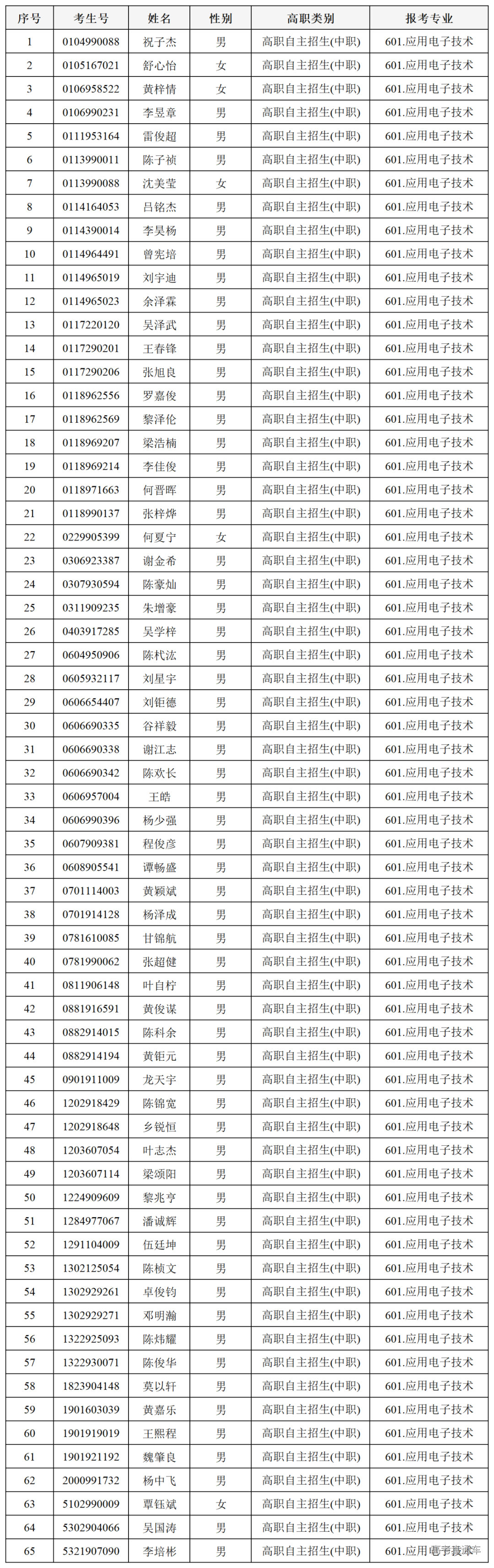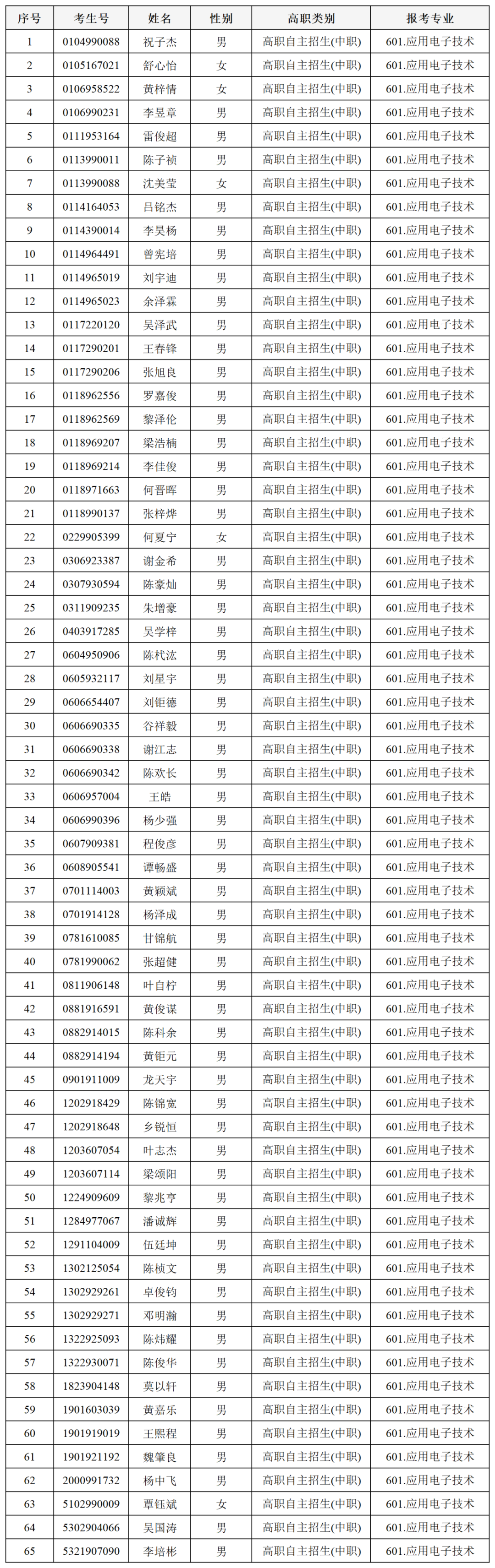 各位考生:经学校审核,祝子杰等65名考生符合我校2025年普通高职自主招生(601应用电子技术专业)报名资格,现予公布。考生须于5月13日14:00前完成网上缴费,未在规定时间内缴纳考试费者,以自动放弃考试资格处理。